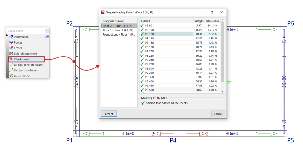 La opción "Comprobar serie" permite seleccionar una viga inclinada de perfil metálico, diagonales de arriostramiento o arriostramientos en V y consultar en la ventana emergente el perfil seleccionado durante el proceso de dimensionamiento, así como el resto de perfiles de la misma serie.