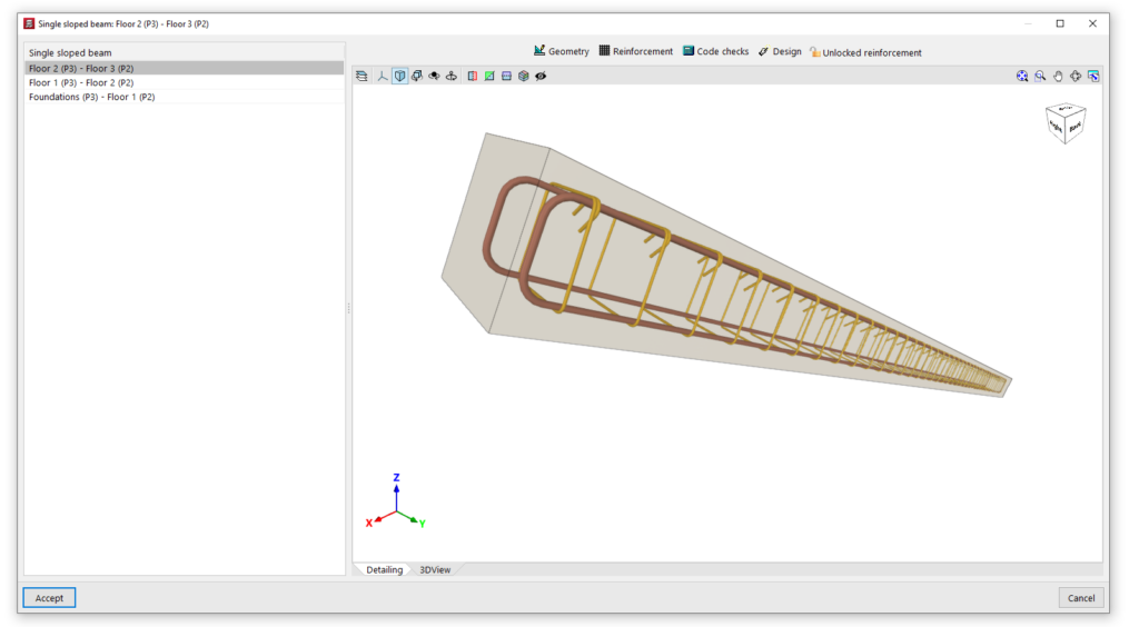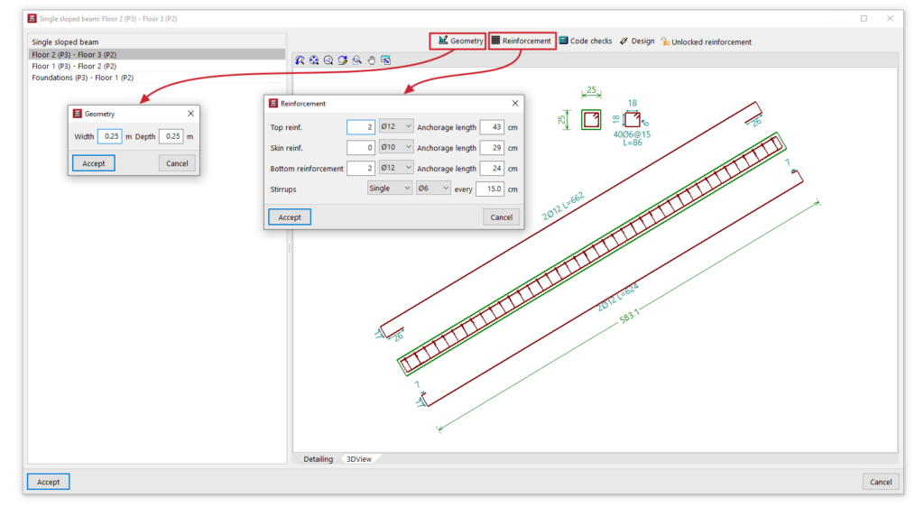 La opción "Editar armaduras" permite seleccionar una viga inclinada simple de hormigón armado y consultar y editar las armaduras obtenidas en el cálculo en una ventana de edición.