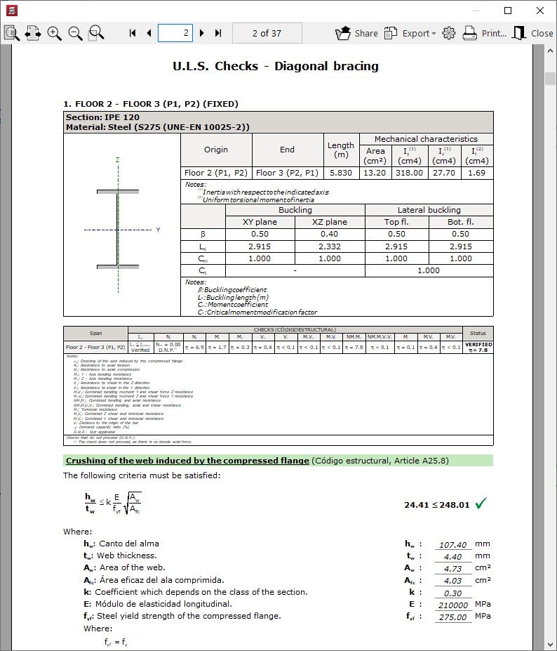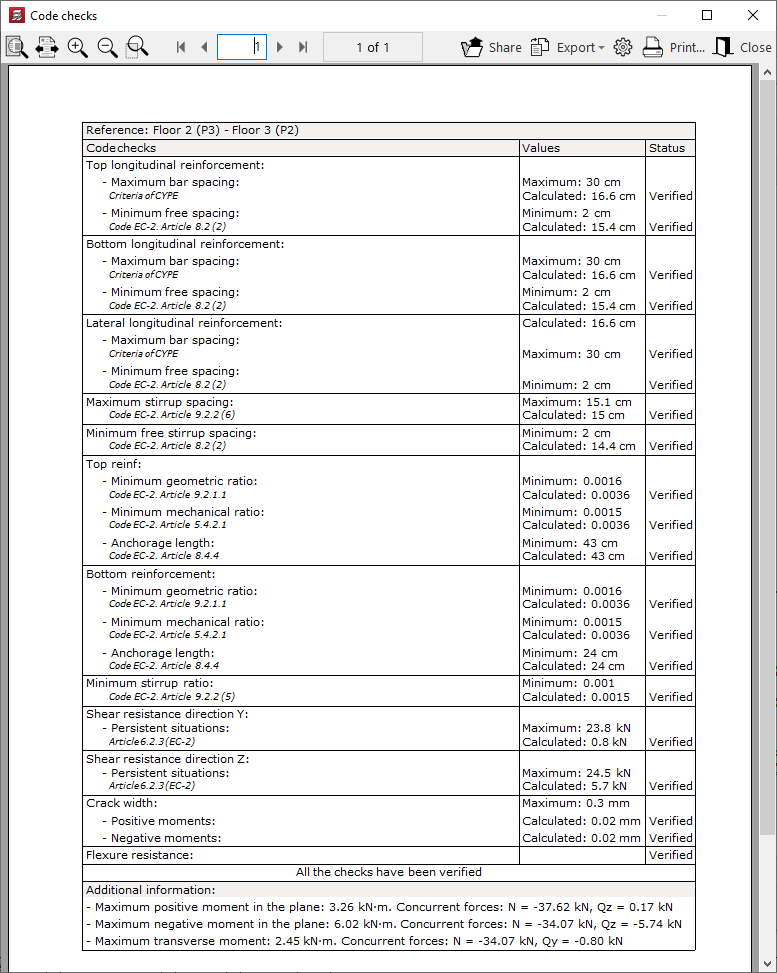 - Seleccionando "Comprobaciones E.L.U. y E.L.S. en el punto pésimo" y pulsando después sobre una viga se muestran los resultados de cada comprobación en el punto en que dicha comprobación es más desfavorable. Aquí se visualizan una a una todas las comprobaciones efectuadas, incluyendo una marca con su "Estado". En la parte inferior, se indica el punto o el artículo de la normativa verificada, así como un desarrollo del cálculo que se ha seguido en cada una de ellas. Para obtener un informe detallado de todas las comprobaciones, se utiliza la opción "Ver el listado completo". La información se puede "Exportar" en diferentes formatos, "Compartir" o "Imprimir".