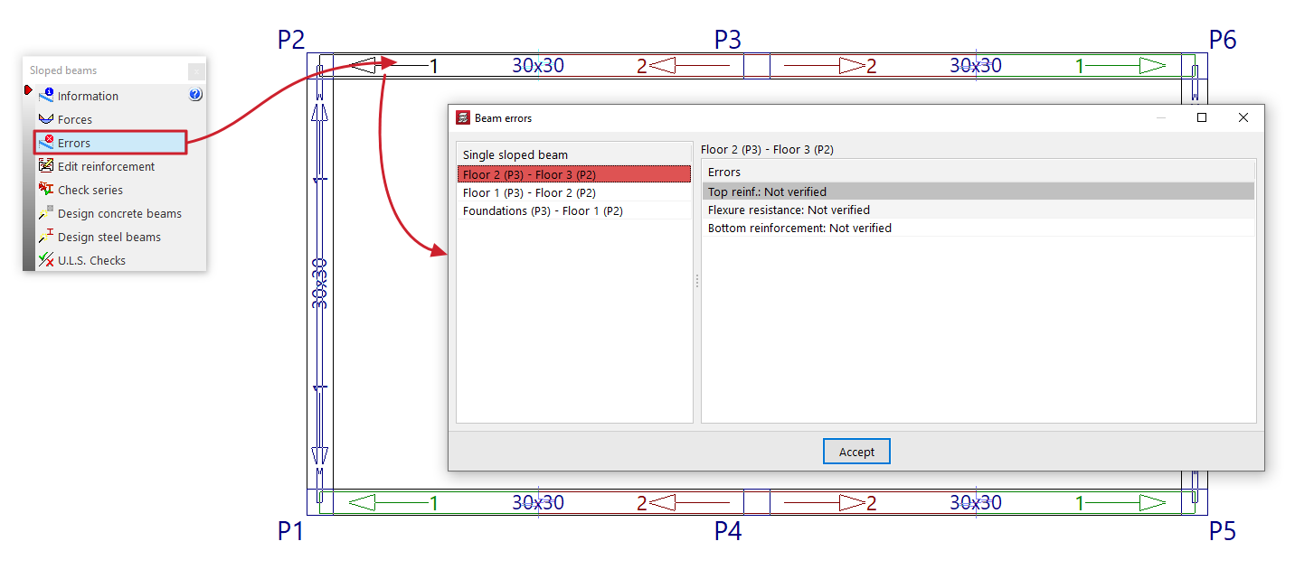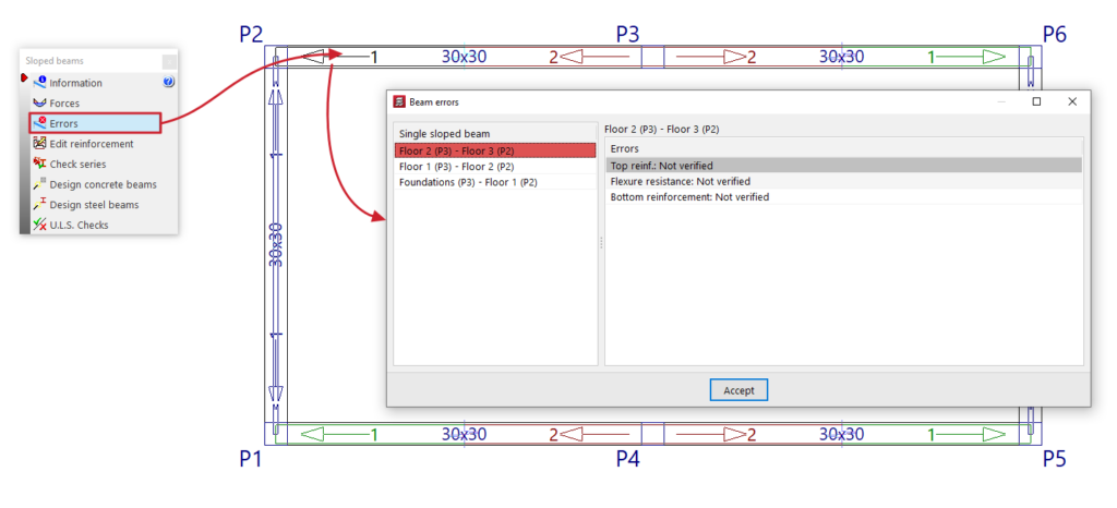 Después, se debe pulsar "Errores de vigas" y hacer clic sobre cualquiera de las vigas del grupo.