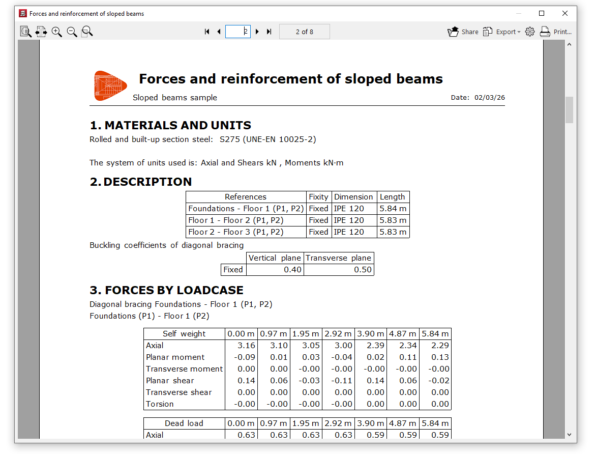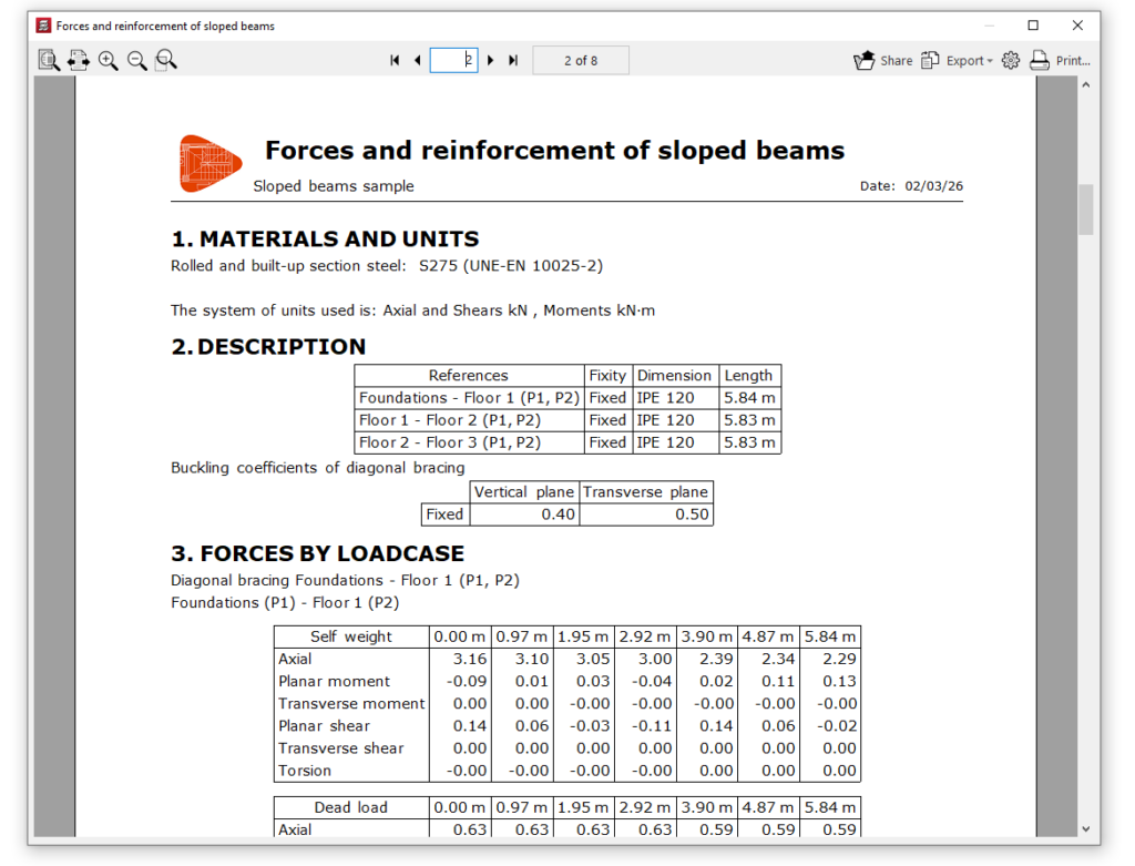 Este listado incluye los materiales, descripción, cargas (en las vigas inclinadas simples), esfuerzos por hipótesis, esfuerzos por combinaciones, envolventes de esfuerzos, coeficiente de aprovechamiento (en el caso de perfiles metálicos), resultados de dimensionado (o de armado en el caso de las vigas de hormigón), mediciones (en las vigas de hormigón), errores de dimensionado en caso de que existan, y comprobaciones efectuadas.