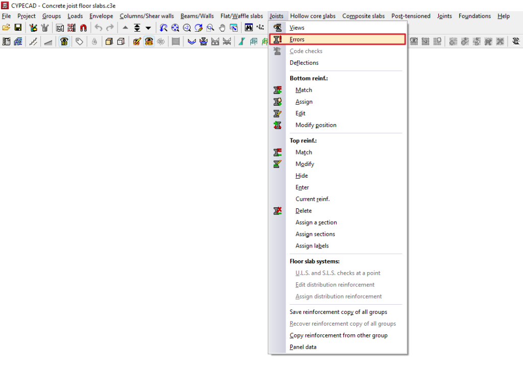La opción "Errores", dentro del menú "Viguetas" de la pestaña "Resultados" permite consultar los errores obtenidos tras el cálculo en cada una de las viguetas.