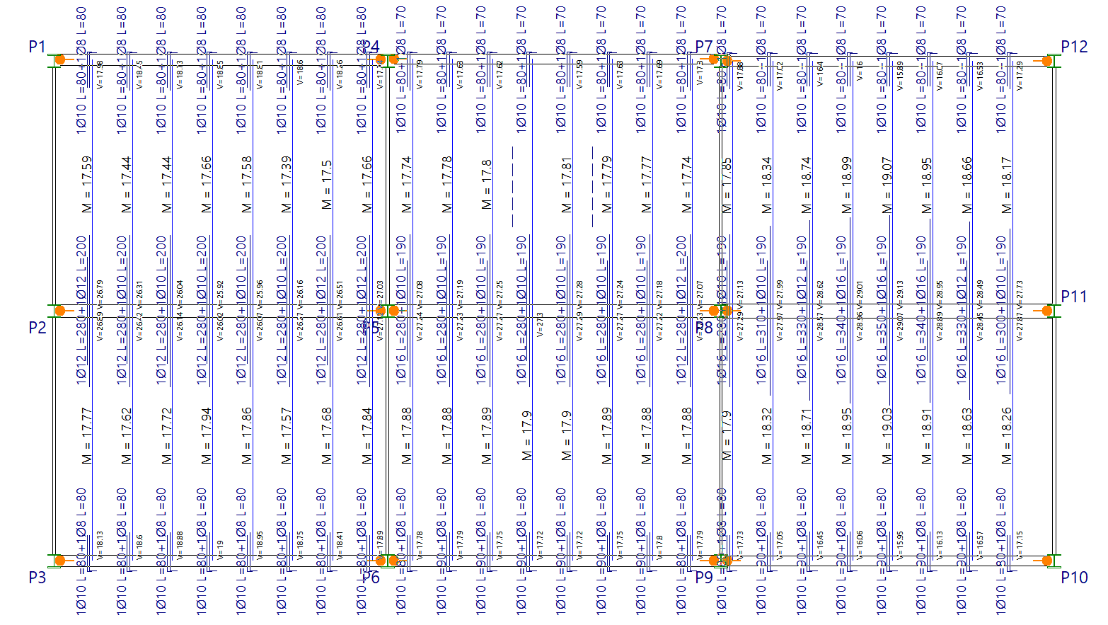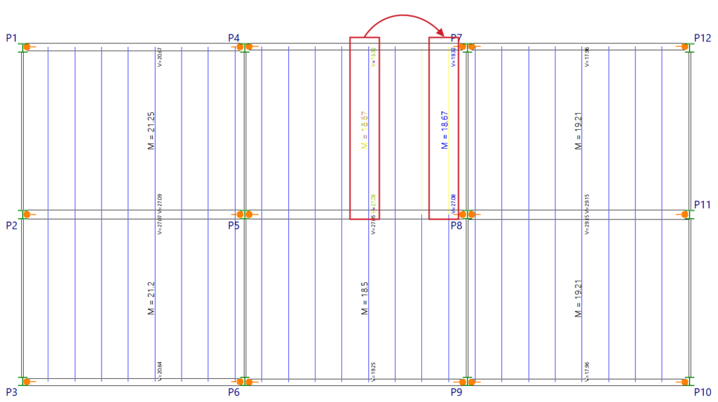 Si esta opción está activada (junto con las opciones "Momentos (kN.m/m)/Tipos visibles" y/o "Cortantes (kN/m) Visibles"), se rotulan en planta junto a cada nervio los momentos flectores mayorados por metro de ancho y/o el valor del cortante mayorado por metro de ancho en el borde de apoyo en todos los tipos de viguetas. - Ver agrupados