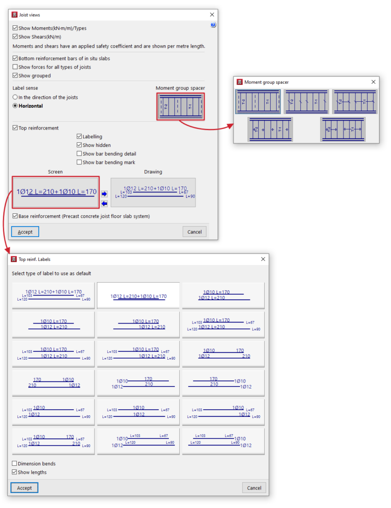Este selector permite ajustar la orientación de los textos de rotulado de los momentos y cortantes en algunas versiones. Este puede ser "En la dirección de las viguetas" u "Horizontal". - Separador de grupos de momentos