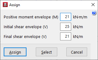 Para ello, se definen los datos a asignar en la ventana emergente. Después, se pulsa en "Asignar" y se seleccionan las viguetas en planta a las que se desean asignar dichos datos (pulsando con el botón izquierdo en un punto del paño para seleccionar la vigueta inicial y, después, pulsando en otro punto para seleccionar la vigueta final; las viguetas seleccionadas se iluminan en un color diferente). En la ventana emergente también se puede utilizar la opción "Seleccionar" para copiar los datos de una vigueta seleccionada en planta o "Cancelar" para salir de la ventana.