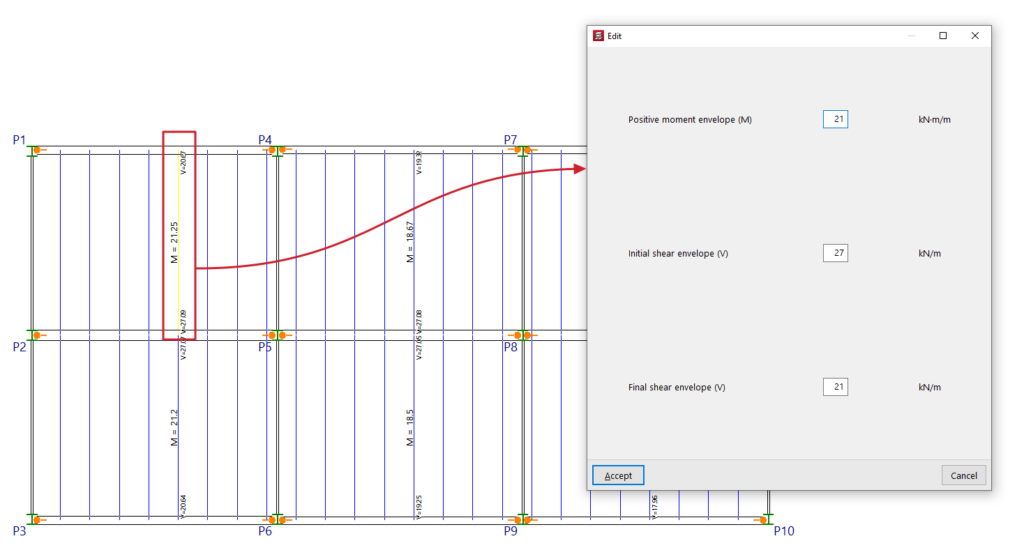 La opción "Editar" permite cambiar en una vigueta individual los datos de los momentos positivos y los esfuerzos cortantes calculados, el armado de positivos, o el tipo de vigueta dispuesto.