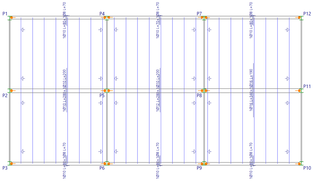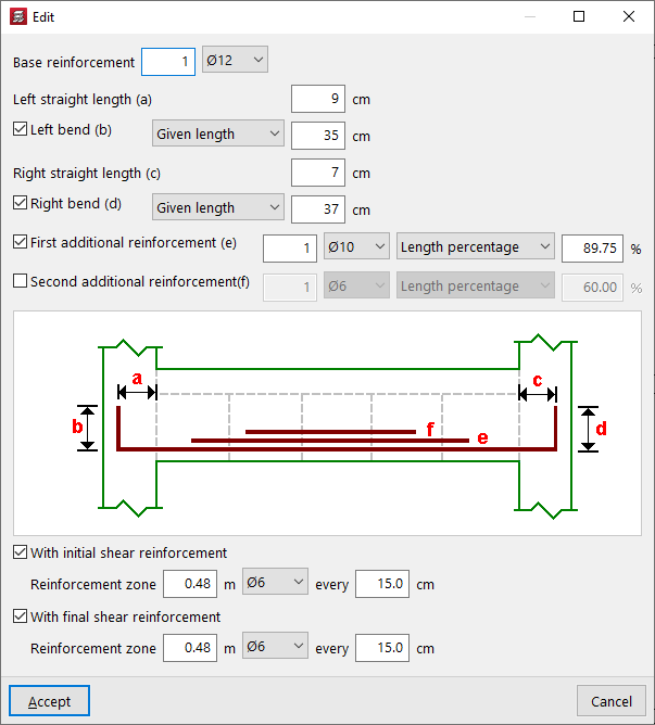 - de forma opcional, se puede disponer un "Primer refuerzo (e)" y/o un "Segundo refuerzo (f)" de armado de positivos (en la "Longitud completa", en una "Longitud dada" o en un "Porcentaje de longitud");