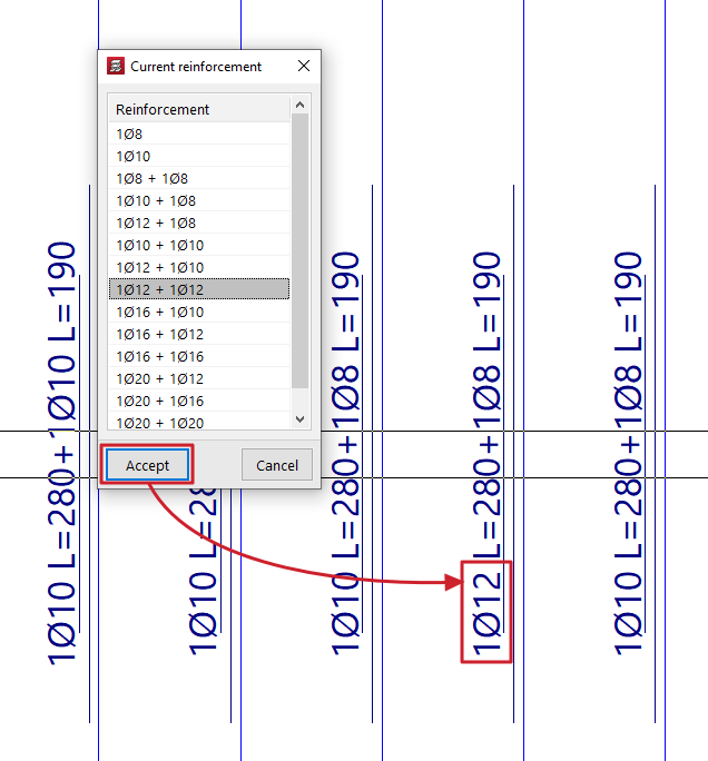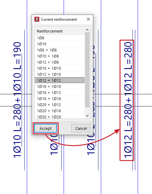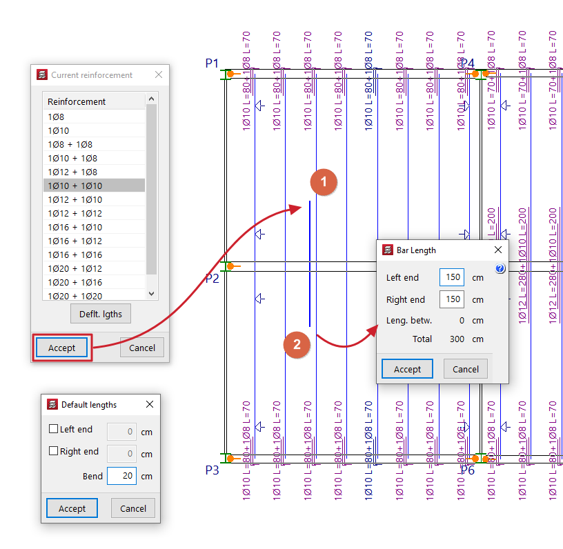 Después, con el botón izquierdo se hace clic en dos puntos en planta próximos a una vigueta para disponer el armado, ya sea a ambos lados de un apoyo intermedio, o cerca de un apoyo de borde y en otro punto más allá del borde de forjado. En el cuadro que aparece, será necesario confirmar las longitudes de ambos extremos, o de uno de los extremos y de la longitud de la patilla, según el caso. Al "Aceptar", se dibujará el armado dispuesto.