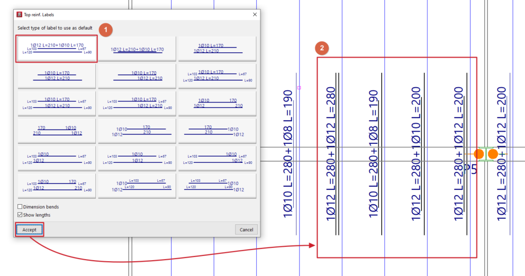 Para ambos casos, el programa permite realizar la selección del tipo de rotulado por defecto de los armados de negativos entre los disponibles en la ventana emergente. Además, permite indicar si se desea "Acotar patillas" y/o "Mostrar longitudes" de barras activando las casillas correspondientes. - Copia de selección de rótulo