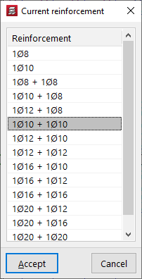 Pulsando el botón derecho del ratón, se abre la ventana "Armadura actual", la cual permite seleccionar el diámetro tipo a asignar entre los disponibles en la tabla de armados de negativos definida en la obra.