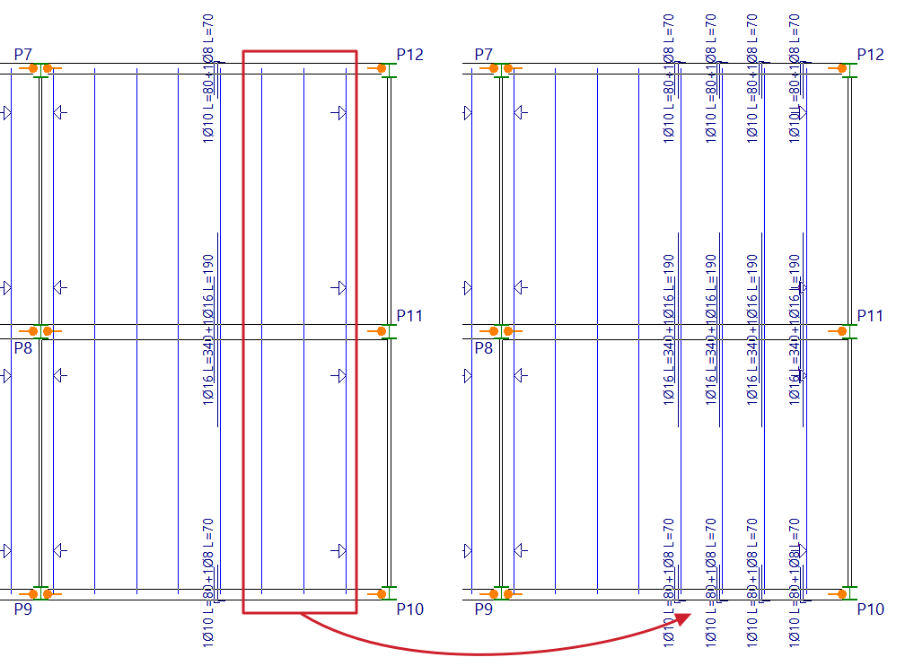 - Si se selecciona "Igualar longitudes", se agrupan las barras de negativos para viguetas continuas con la misma armadura cuyas longitudes parciales (a ambos lados) no difieran del porcentaje o del valor indicado. Las longitudes parciales de las armaduras se igualan a la longitud mayor o a la longitud media del grupo, en función de la opción seleccionada.