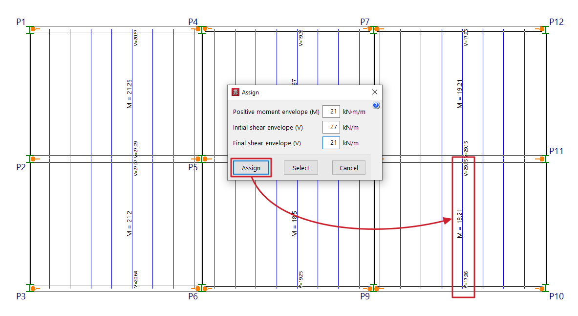 La opción "Asignar" permite modificar los momentos positivos y los esfuerzos cortantes calculados en las viguetas, el armado de positivos, o el tipo de vigueta dispuesto, mediante una asignación masiva de datos a todos los elementos seleccionados.
