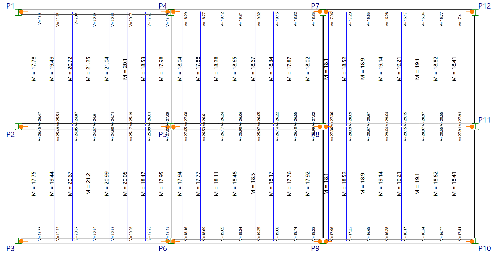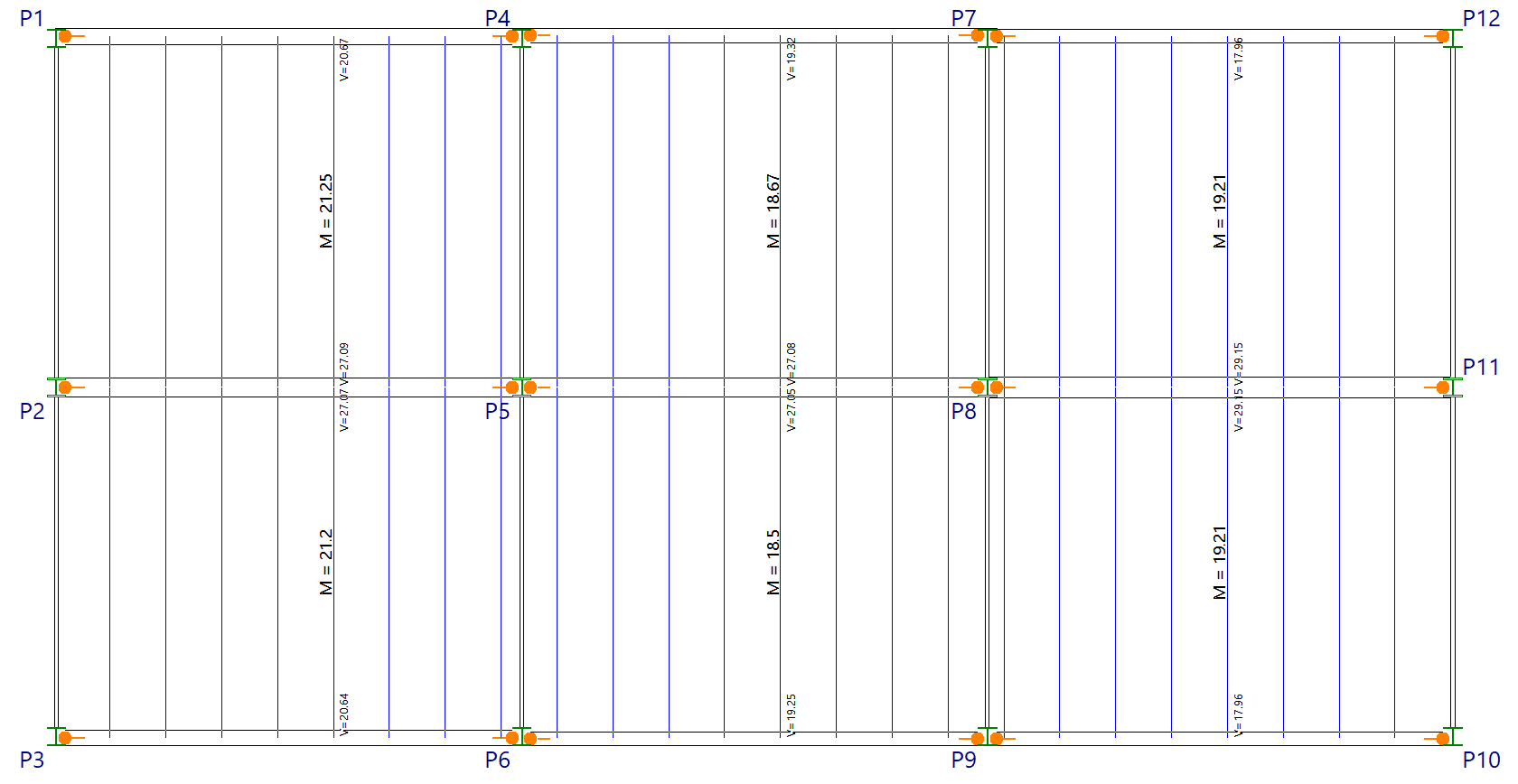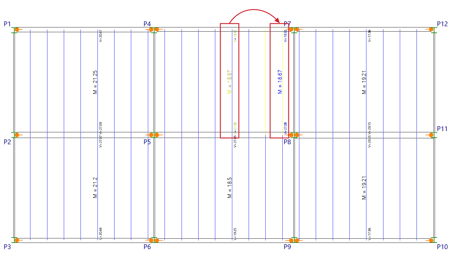 Si esta opción está activada (junto con las opciones "Momentos (kN.m/m)/Tipos visibles" y/o "Cortantes (kN/m) Visibles"), se rotulan en planta junto a cada nervio los momentos flectores mayorados por metro de ancho y/o el valor del cortante mayorado por metro de ancho en el borde de apoyo en todos los tipos de viguetas. - Ver agrupados