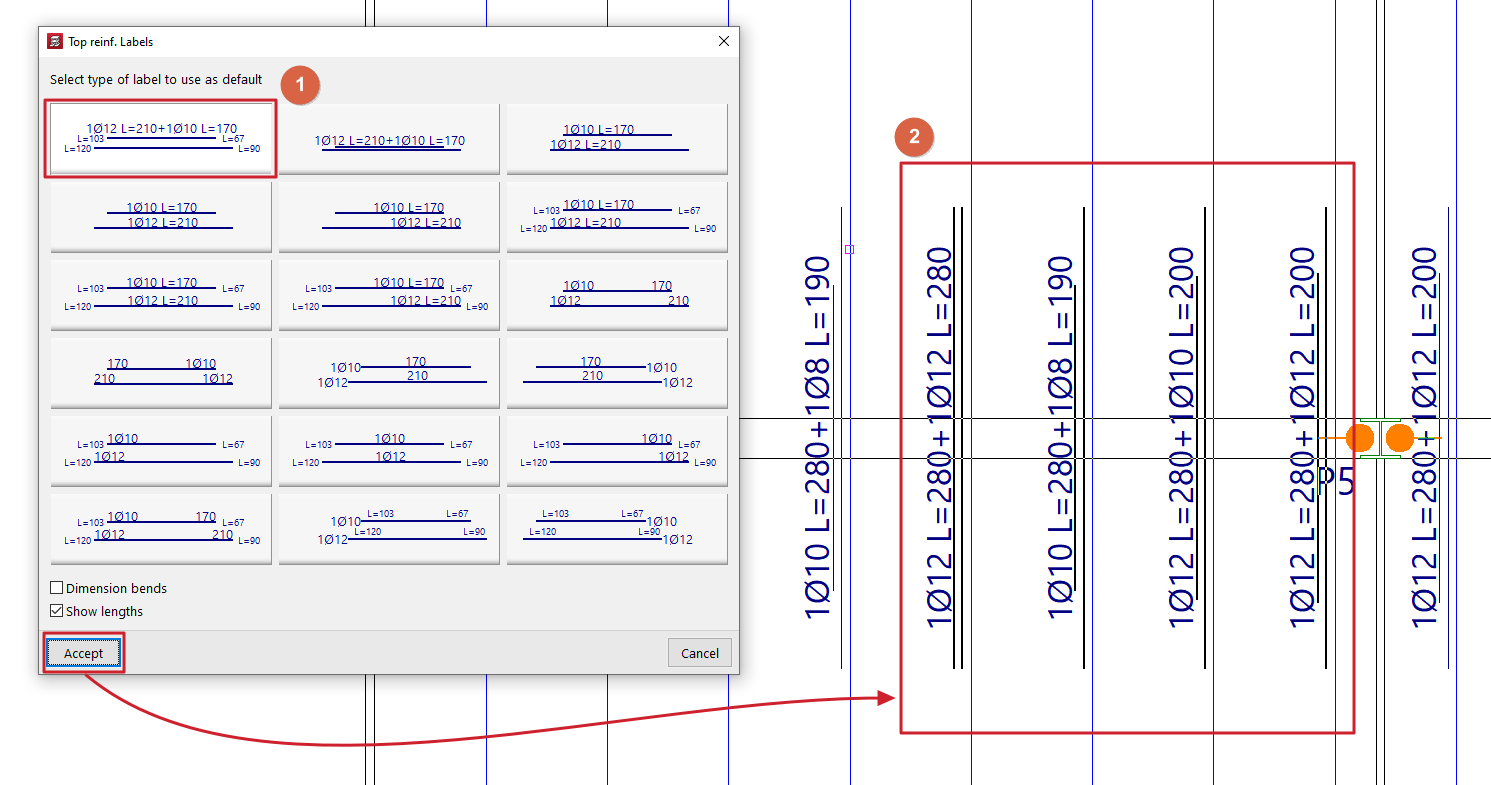 Para ambos casos, el programa permite realizar la selección del tipo de rotulado por defecto de los armados de negativos entre los disponibles en la ventana emergente. Además, permite indicar si se desea "Acotar patillas" y/o "Mostrar longitudes" de barras activando las casillas correspondientes. - Copia de selección de rótulo