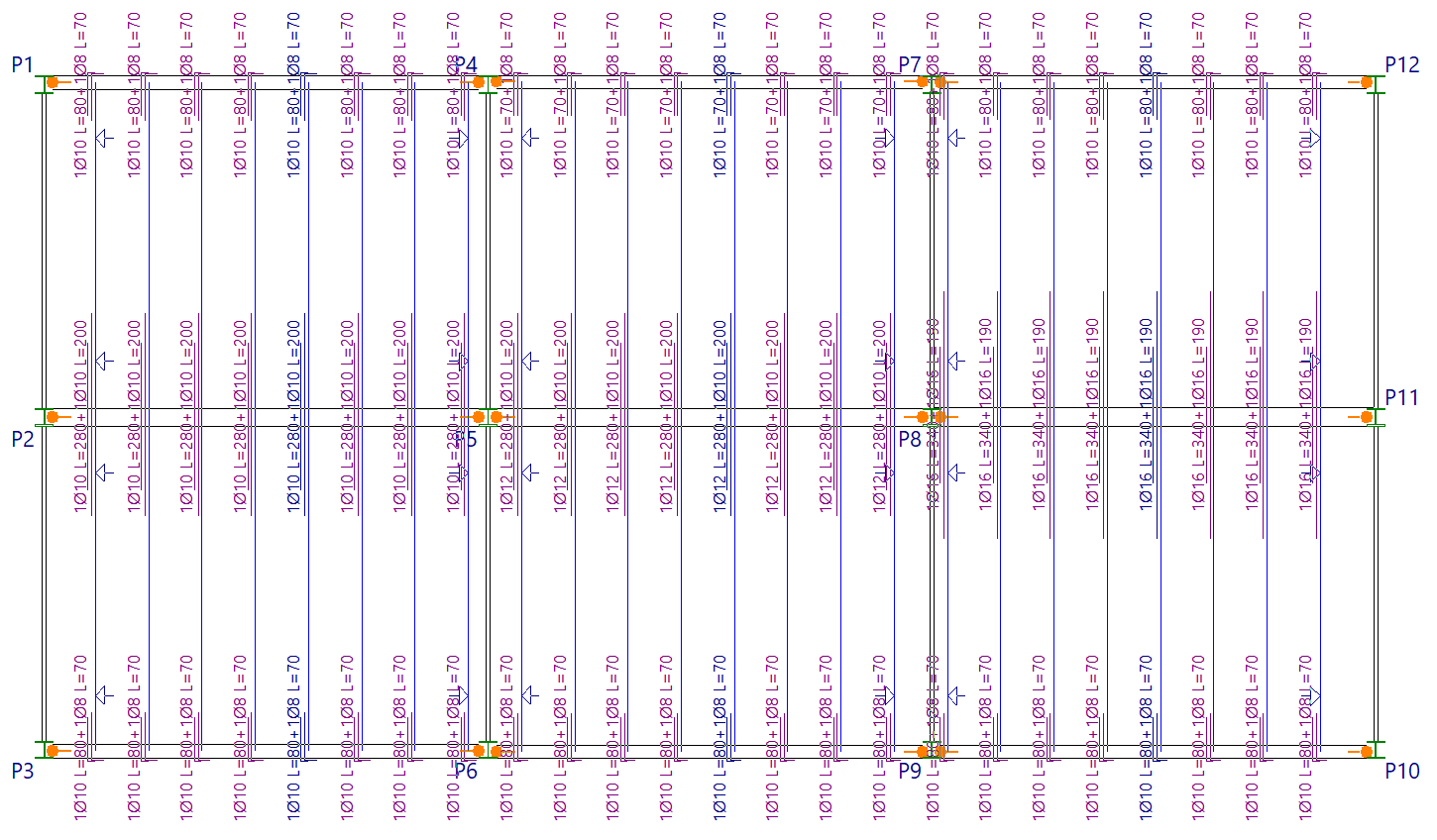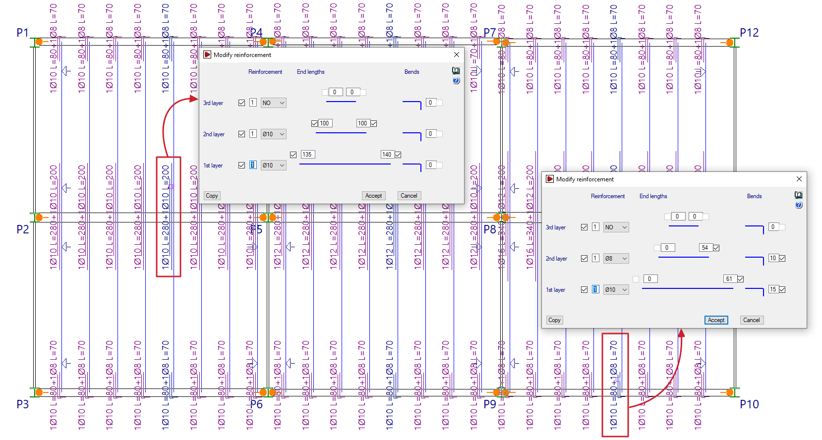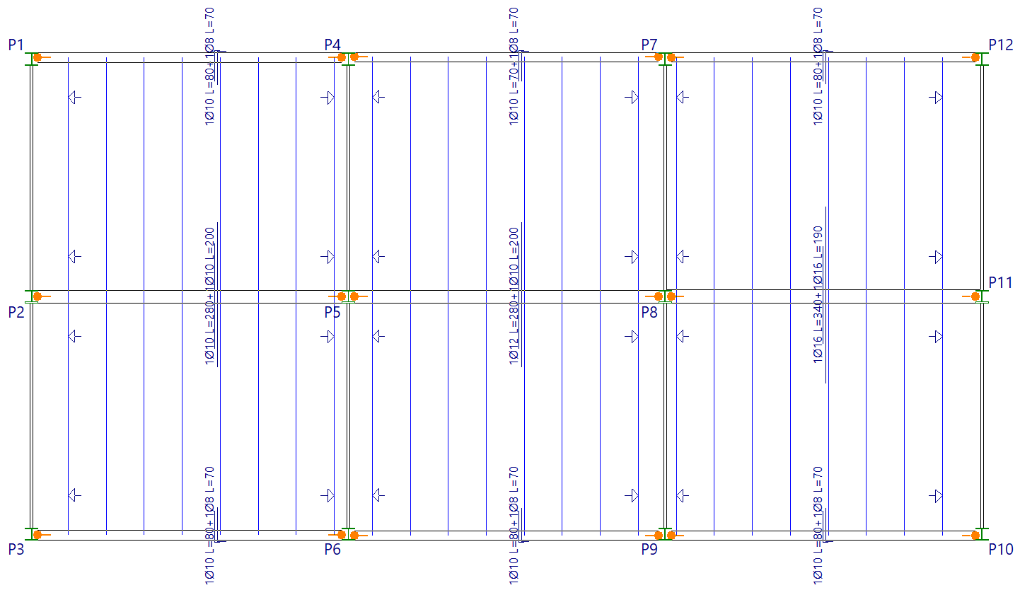 - de forma opcional, se puede disponer un "Primer refuerzo (e)" y/o un "Segundo refuerzo (f)" de armado de positivos (en la "Longitud completa", en una "Longitud dada" o en un "Porcentaje de longitud");
