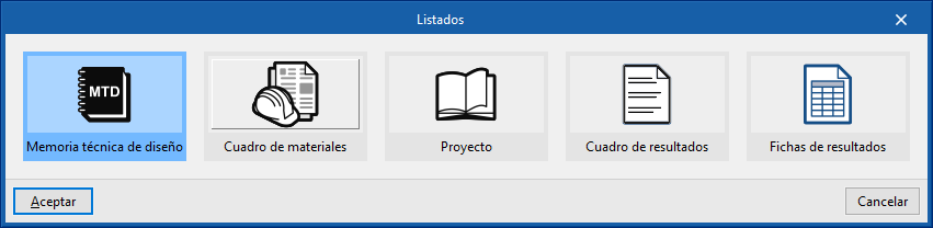 La obtención de cada modelo de MTD está disponible seleccionando el botón "Listados" de la barra de herramientas superior y la opción "Memoria técnica de diseño" en el diálogo emergente.