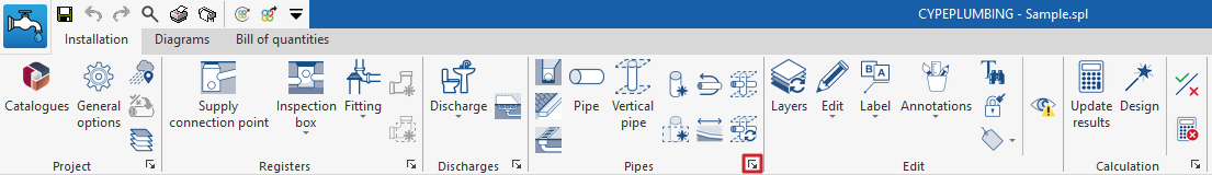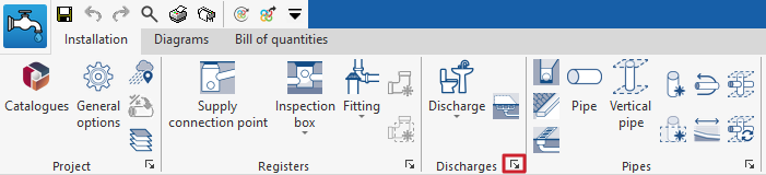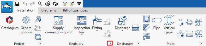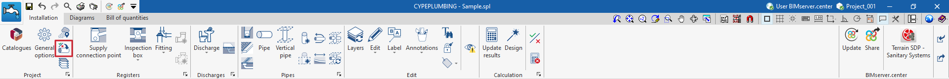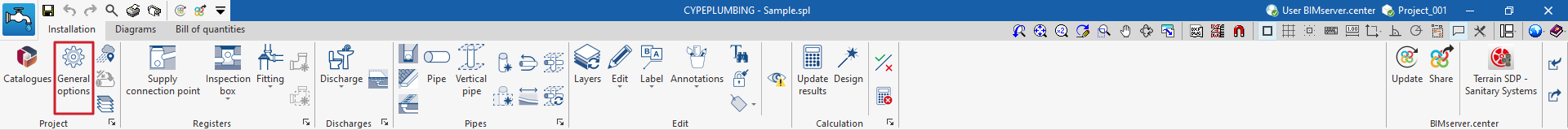 Si se desea posteriormente cargar la configuración o modificarla de forma personalizada, o gestionar los catálogos de la obra, se pueden utilizar respectivamente las utilidades "Opciones generales" y "Catálogos" de la barra de herramientas superior de la pestaña "Instalación", disponible en las solapas "Water Systems" y "Sanitary Systems".