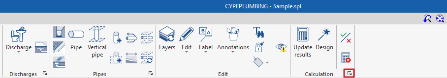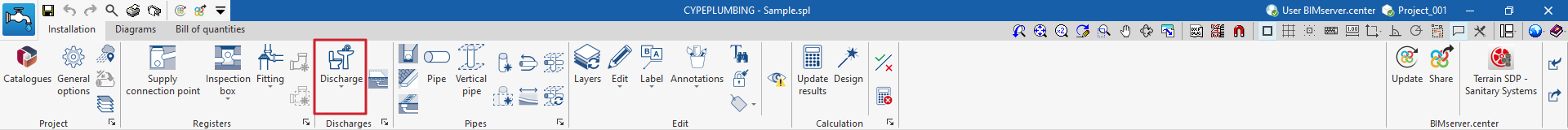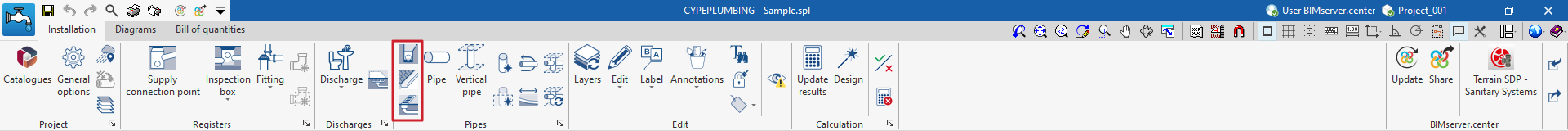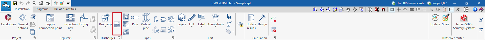 - Una barra de herramientas superior en la que se encuentran las herramientas para gestionar los catálogos y las opciones del proyecto; introducir y editar los elementos de la instalación de evacuación de aguas (puntos de acometida, arquetas, accesorios, descargas, áreas de drenaje, tuberías, tuberías drenantes, canalones y sumideros longitudinales); y realizar el cálculo, la comprobación y el dimensionamiento de la instalación.