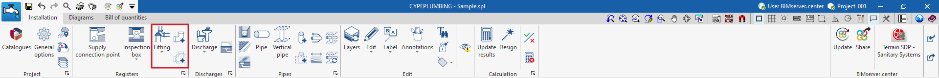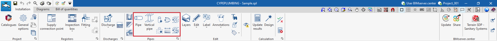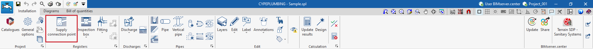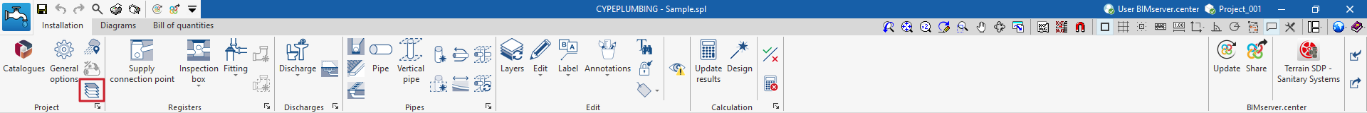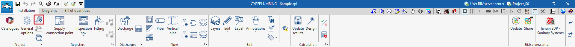 Una vez creada la nueva obra, se accede a la interfaz general del programa. En cualquier momento del trabajo, se pueden compartir o importar archivos del proyecto a través del bloque "BIMserver.center", ubicado en la parte superior derecha de la interfaz general de la pestaña "Instalación".