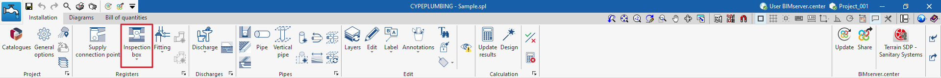 - Disposición del punto de acometida de la instalación de evacuación de aguas en el área de trabajo (desde "Registros", "Punto de acometida").