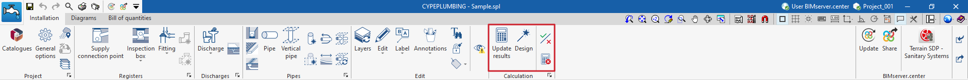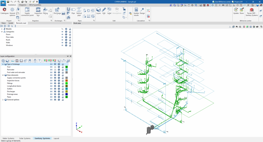 - (Opcional) Vinculación a BIMserver.center e importación del modelo geométrico, definición de la configuración y la normativa de aplicación, importación de catálogos y generación de consumos y descargas a partir del equipamiento sanitario leído del modelo BIM.