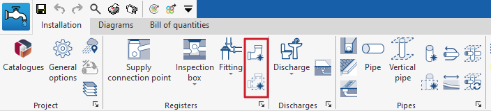 En el bloque "Proyecto" de la barra de herramientas principal de la pestaña "Instalación", ya sea dentro de las solapas "Water Systems", "Sanitary Systems" o "Solar Systems", se encuentran las herramientas para realizar la gestión de catálogos de fabricantes en las instalaciones de suministro de agua, de evacuación de aguas y de energía solar térmica, respectivamente:
