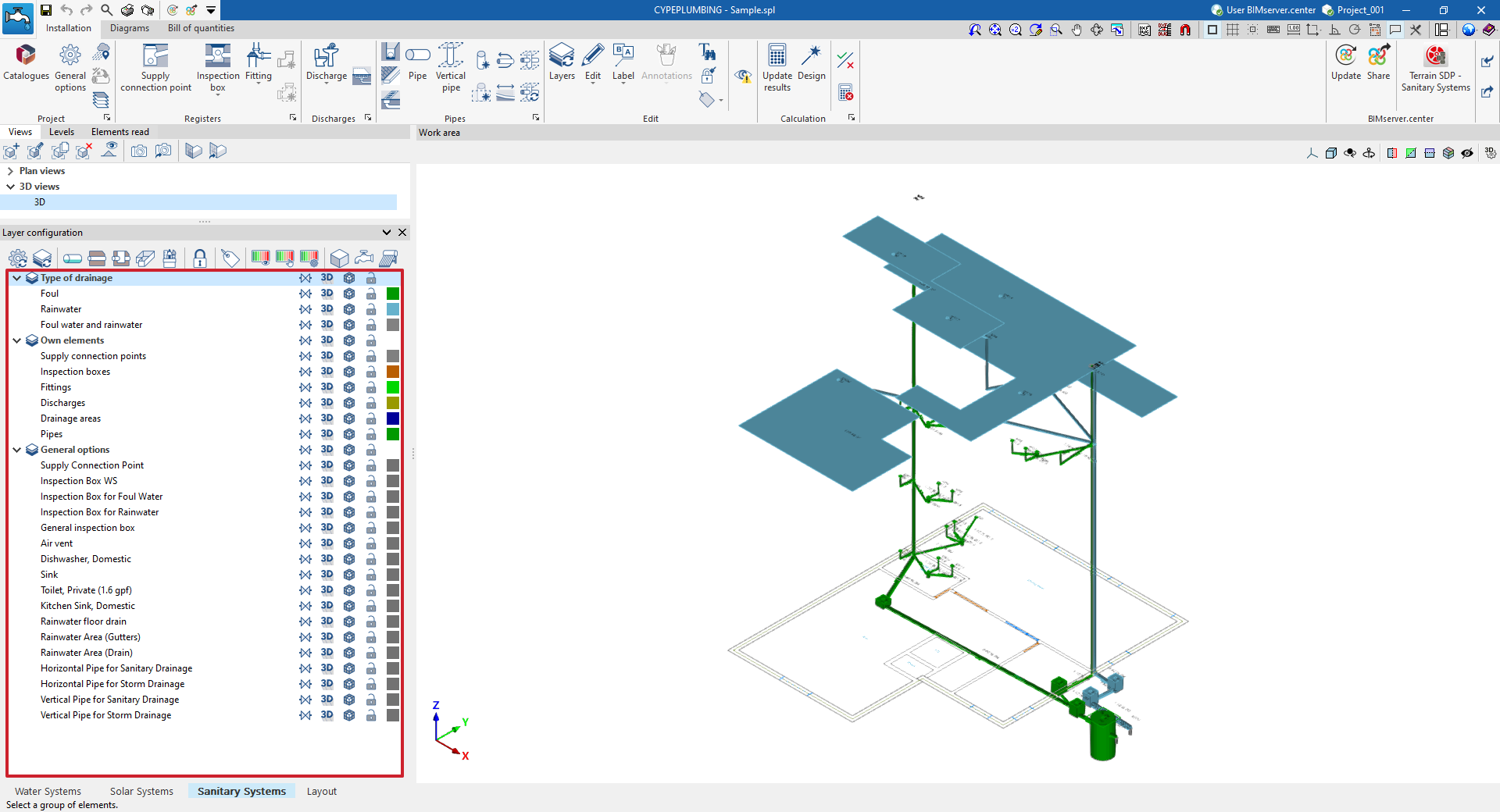 La pestaña "Instalación" presenta un entorno de trabajo que permite realizar el diseño de la instalación de evacuación de aguas, tanto en una vista 3D como en cualquier tipo de vista 2D (como planos de planta y alzados). De esta manera, se pueden introducir los elementos de la instalación utilizando la vista más adecuada en cada momento.