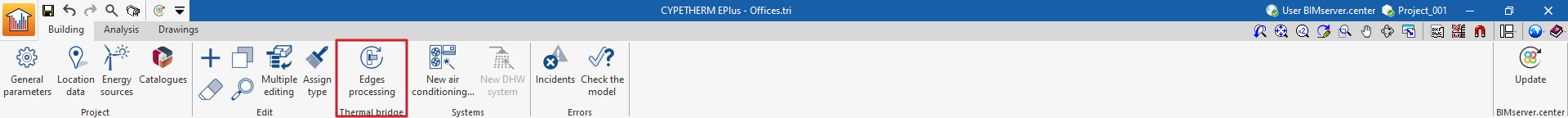 Este proceso se puede llevar a cabo en el comienzo y en la importación de una obra y, de forma equivalente, al pulsar sobre la opción "Procesamiento de aristas", en el bloque "Puentes térmicos" de la barra de herramientas superior de la pestaña "Edificio". El uso de esta herramienta exige que el edificio esté definido sin errores: