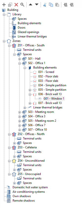 En la biblioteca se introducen los tipos de recinto, elementos constructivos (fachadas, medianeras, tabiques, muros cortina, muros de sótano, cubiertas, voladizos, forjados entre pisos y soleras), puertas, huecos acristalados (como ventanas y lucernarios) y puentes térmicos lineales de la obra. - Zonas