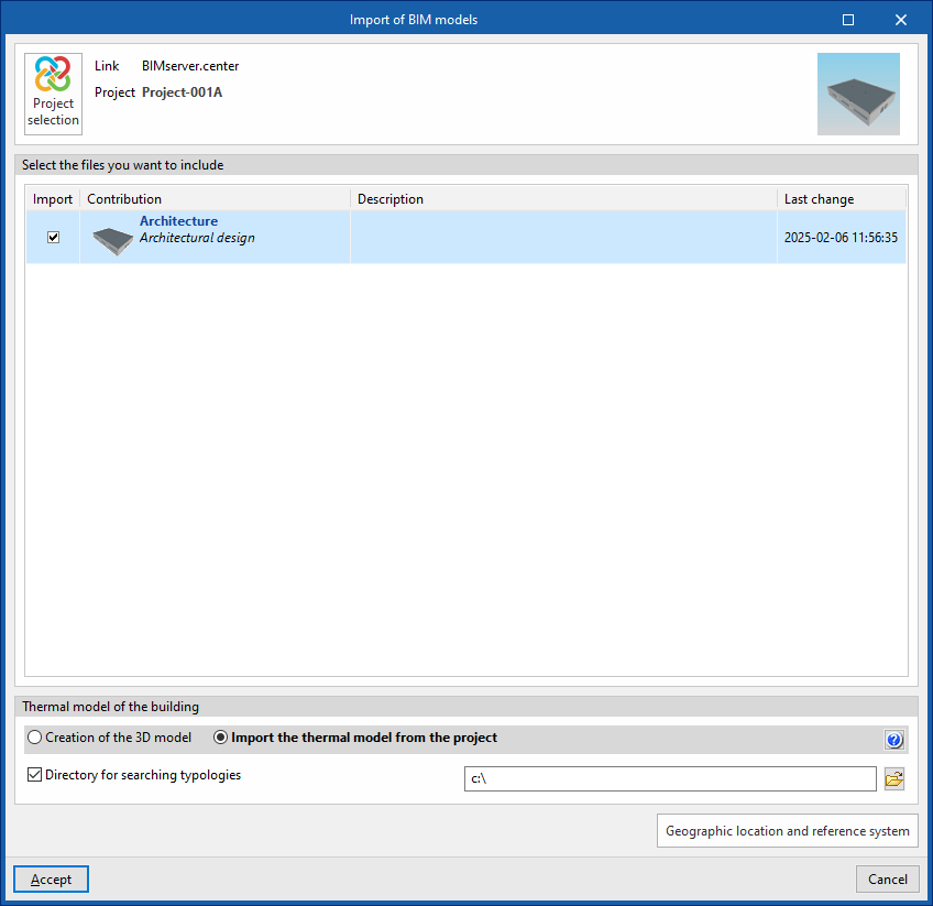 - Si el modelo se ha diseñado en IFC Builder y compartido en BIMserver.center, es posible importar la información geométrica sin necesidad de utilizar ningún programa intermedio.