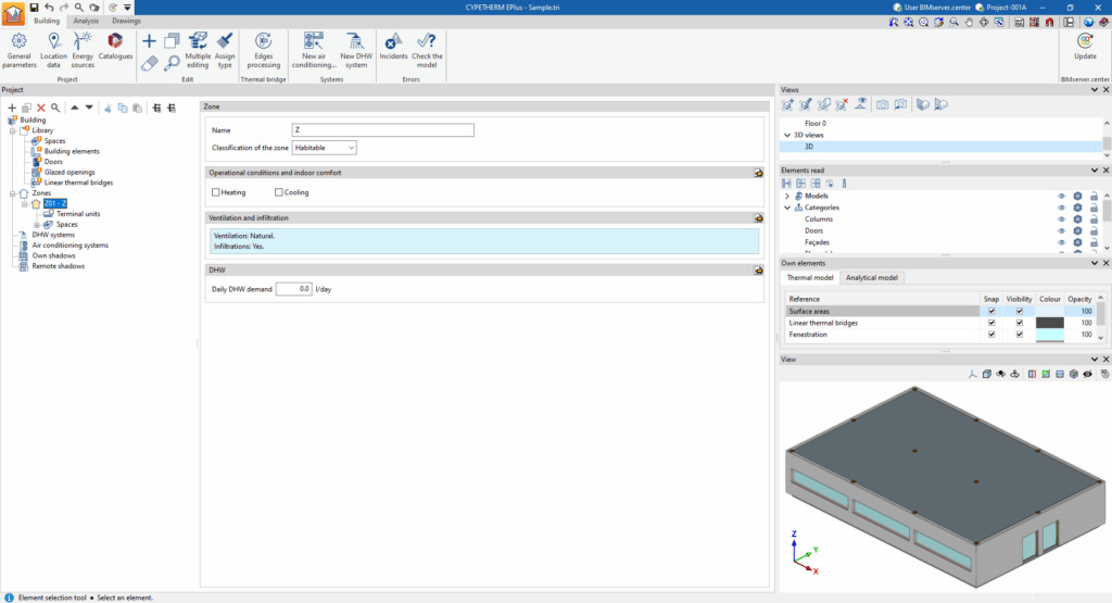 - (Opcional) Vinculación a BIMserver.center. Se puede realizar la importación de la geometría del edificio, las soluciones constructivas, las sombras, la potencia de iluminación de recintos y la definición de algunos sistemas de climatización a partir del modelo BIM. En el proceso de importación también se configura la ventilación de las zonas habitables y se puede realizar el procesamiento de aristas en los casos correspondientes.