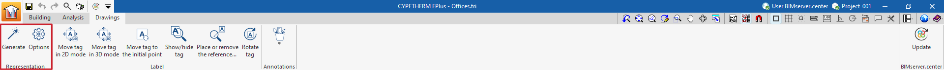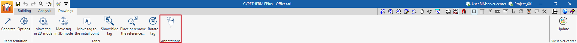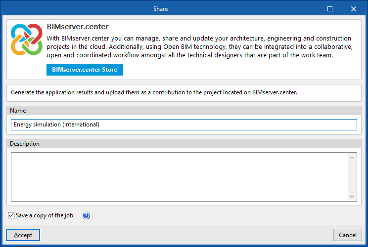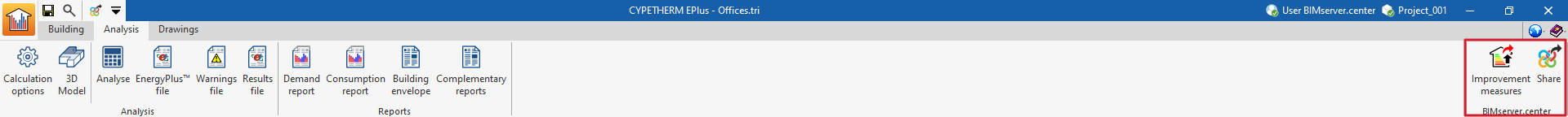 Para compartir los resultados de CYPETHERM EPlus e incluirlos junto al modelo BIM vinculado, se utilizan la opción "Compartir", disponible en el bloque "BIMserver.center" de la barra de herramientas de la pestaña "Simulación energética".