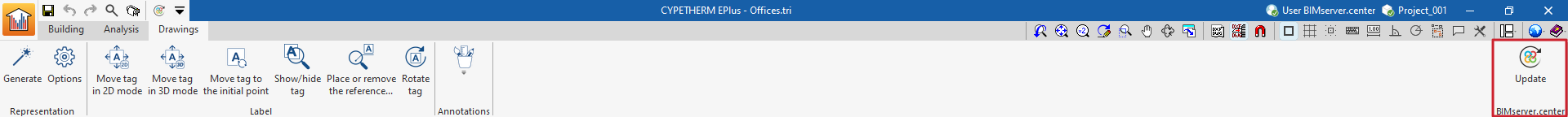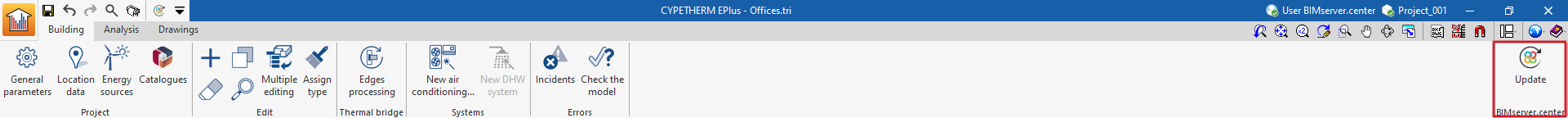 El botón "Actualizar", disponible en el bloque "BIMserver.center" de la barra de herramientas de las pestañas "Edificio" y "Planos", permite sincronizar los cambios realizados en el modelo BIM.