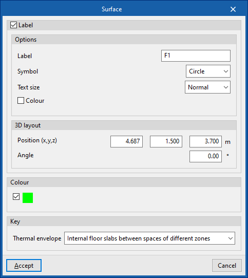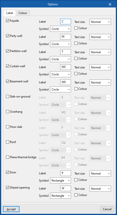 Permite modificar el texto de la etiqueta, su símbolo, el tamaño del texto y su color para cada uno de los elementos del modelo:- Fachada