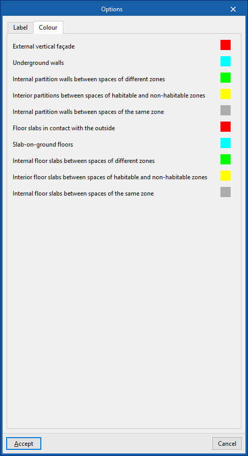Permite modificar el color de representación de los elementos del modelo según su categoría:- Cerramiento vertical exterior