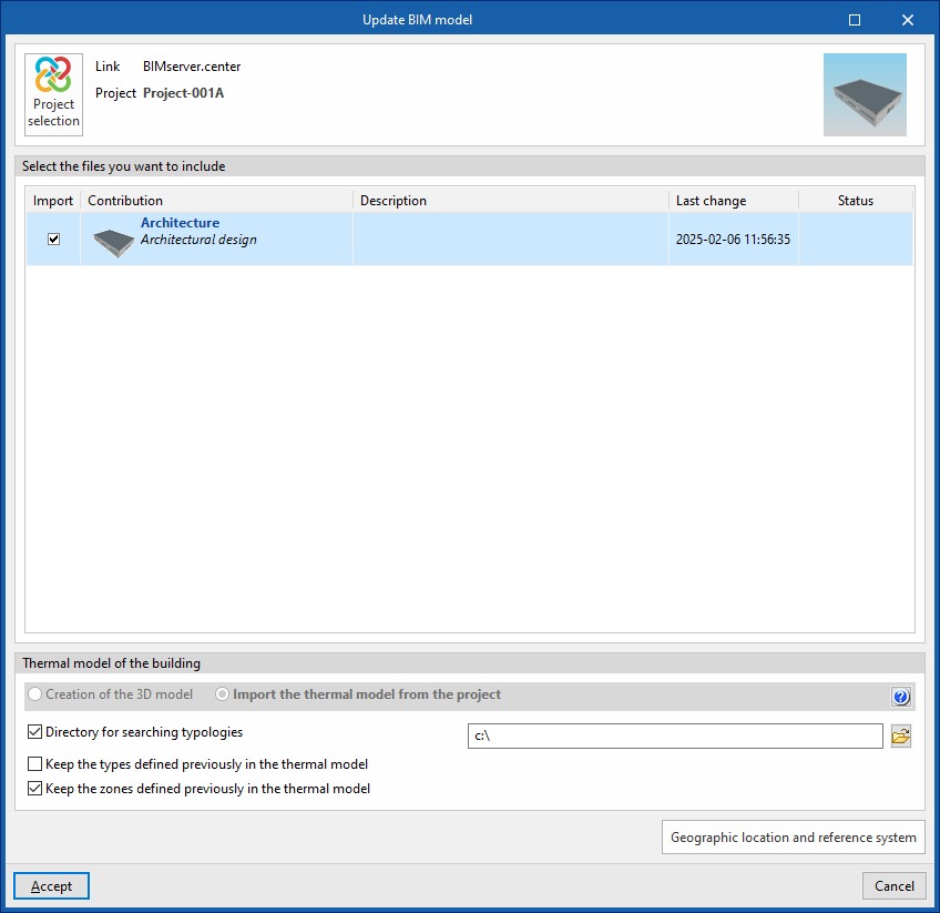 Cuando se accede a un programa conectado a la plataforma, este es capaz de establecer la conexión con un proyecto en BIMserver.center. De esta forma, los archivos de los proyectos desarrollados colaborativamente en BIMserver.center se mantienen actualizados.