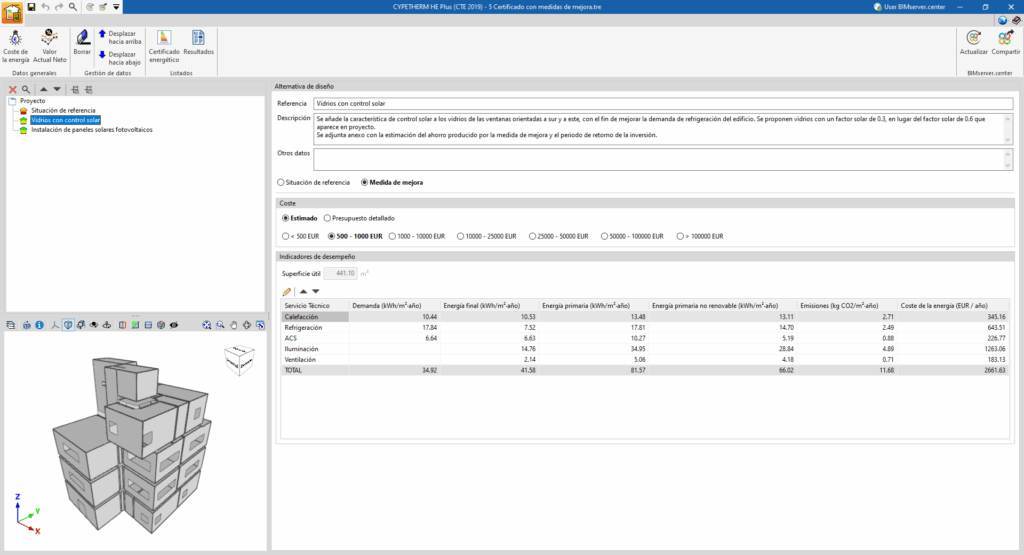 Al seleccionar "Certificación energética con medidas de mejora" en el proceso de creación de una obra nueva, se accede a un entorno que permite elaborar el Certificado de Eficiencia Energética del edificio incorporando medidas de mejora basadas en los resultados de distintas simulaciones disponibles en un proyecto de BIMserver.center, así como efectuar el estudio económico y energético de las distintas alternativas de diseño.
