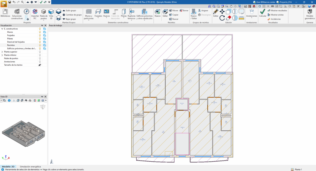 Se sitúa en la parte inferior del lateral izquierdo y muestra el modelo del edificio enviado al motor de cálculo, disponible también desde el botón "Modelo 3D".