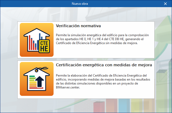 Al abrir una obra nueva en CYPETHERM HE Plus, el programa ofrece dos posibilidades, "Verificación normativa" y "Certificación energética con medidas de mejora", que permiten acceder a entornos de trabajo diferentes.