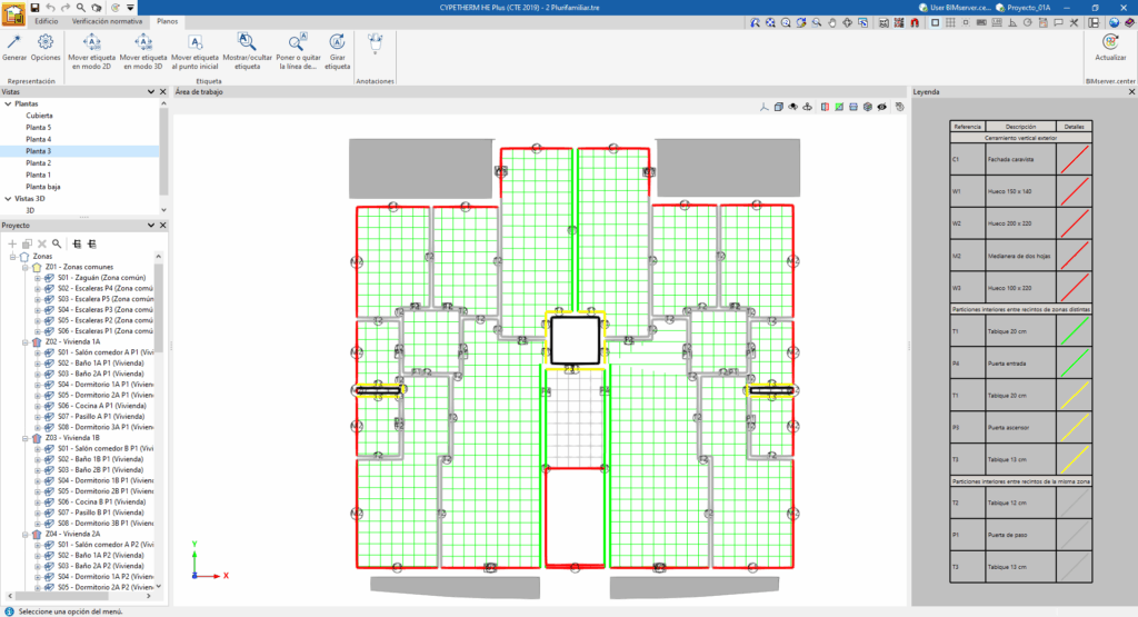 La pestaña "Planos" contiene los planos de cada planta del edificio, donde se representan los elementos constructivos que lo componen.