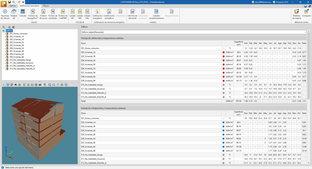 Como resultado del cálculo se obtienen listados de cumplimiento normativo, la certificación de la eficiencia energética e informes de consumo, demanda y confort interior.