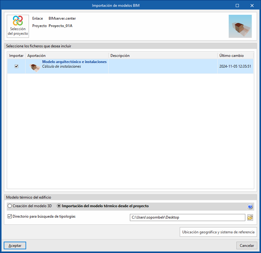 - (Opcional) Vinculación a BIMserver.center. Se puede realizar la importación de la geometría del edificio, de las soluciones constructivas, de los datos del emplazamiento, de las sombras, de la potencia de iluminación de recintos y de la definición de los sistemas de climatización a partir del modelo BIM. En el proceso de importación también se configura la ventilación de las zonas habitables y se puede realizar el procesamiento de aristas en los casos correspondientes.