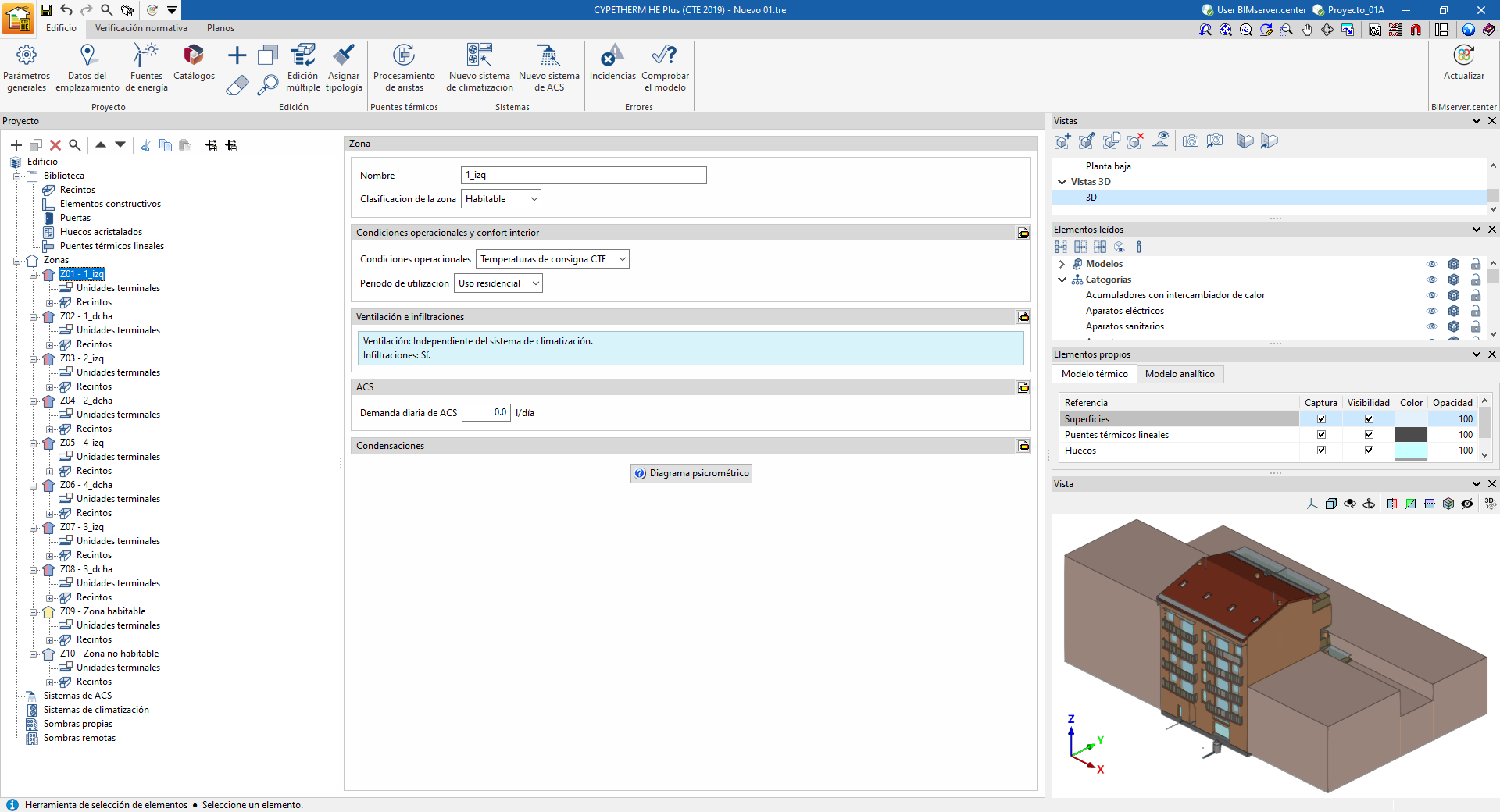 En caso de que se haya importado el modelo térmico a partir de la información contenida en BIMserver.center, el programa se abrirá por la pestaña "Edificio" y habrá generado la geometría del modelo y las bibliotecas de elementos a partir de los datos existentes en el proyecto o en el directorio seleccionado, así como los datos del emplazamiento, la configuración de ventilación en las zonas térmicas habitables y los puentes térmicos lineales a partir de las aristas identificadas en el modelo.