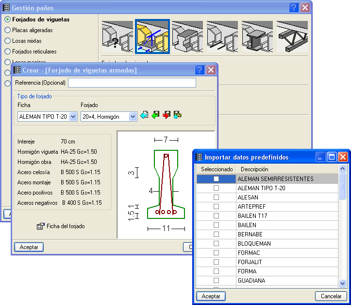 Las fichas de forjados unidireccionales de viguetas in situ que se generen pueden guardarse junto con las fichas de forjados de fabricantes que el programa incorpora. Las bovedillas que se definen para emplearse en los forjados también pueden incluirse en una biblioteca de bovedillas.