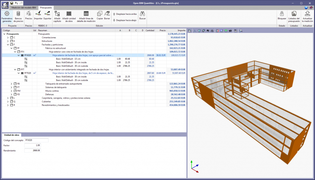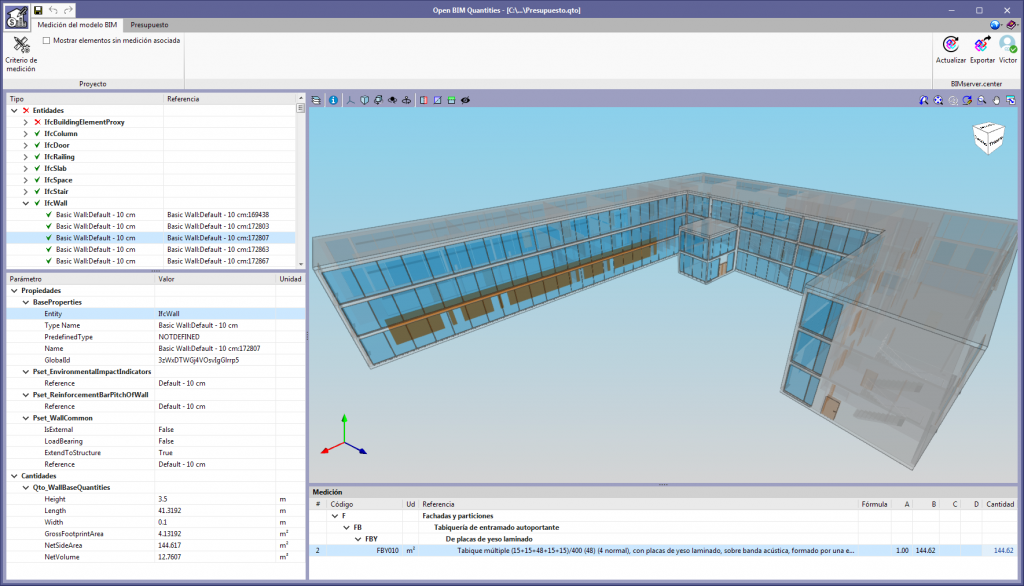Open BIM Quantities es una herramienta destinada a la medición y generación del presupuesto a partir de modelos BIM definidos mediante el estándar IFC. Esta herramienta permite al usuario establecer los criterios de medición que considere oportunos, con el objeto de transformar los datos contenidos en los elementos o componentes del modelo en unidades de obra.