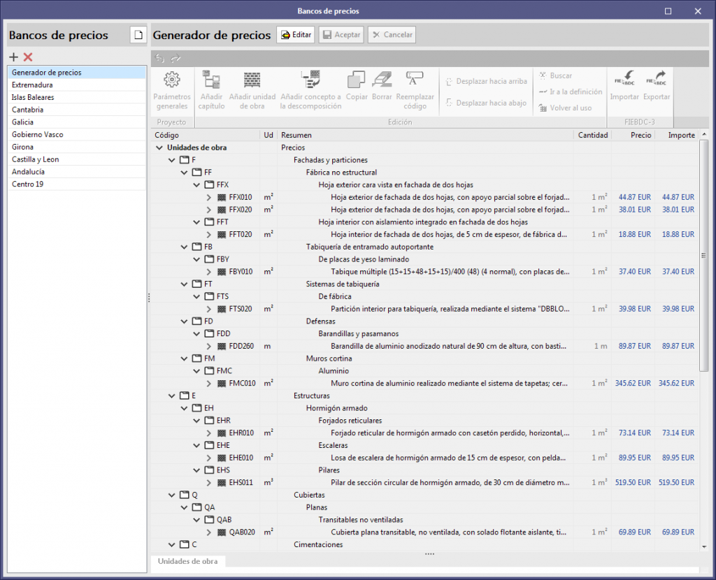 - Importación de bancos de precios en formato FIEBDC-3 del Generador de precios.
