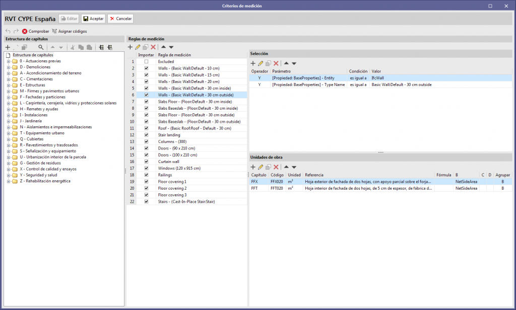 Permiten, por un lado, el filtrado de elementos a partir de sus propiedades y, por otro, indicar cuáles de sus cantidades se emplearán en la medición de las unidades que se van a generar. En definitiva, estas reglas definirán qué elementos deben ser medidos y cómo deben ser medidos o presupuestados.