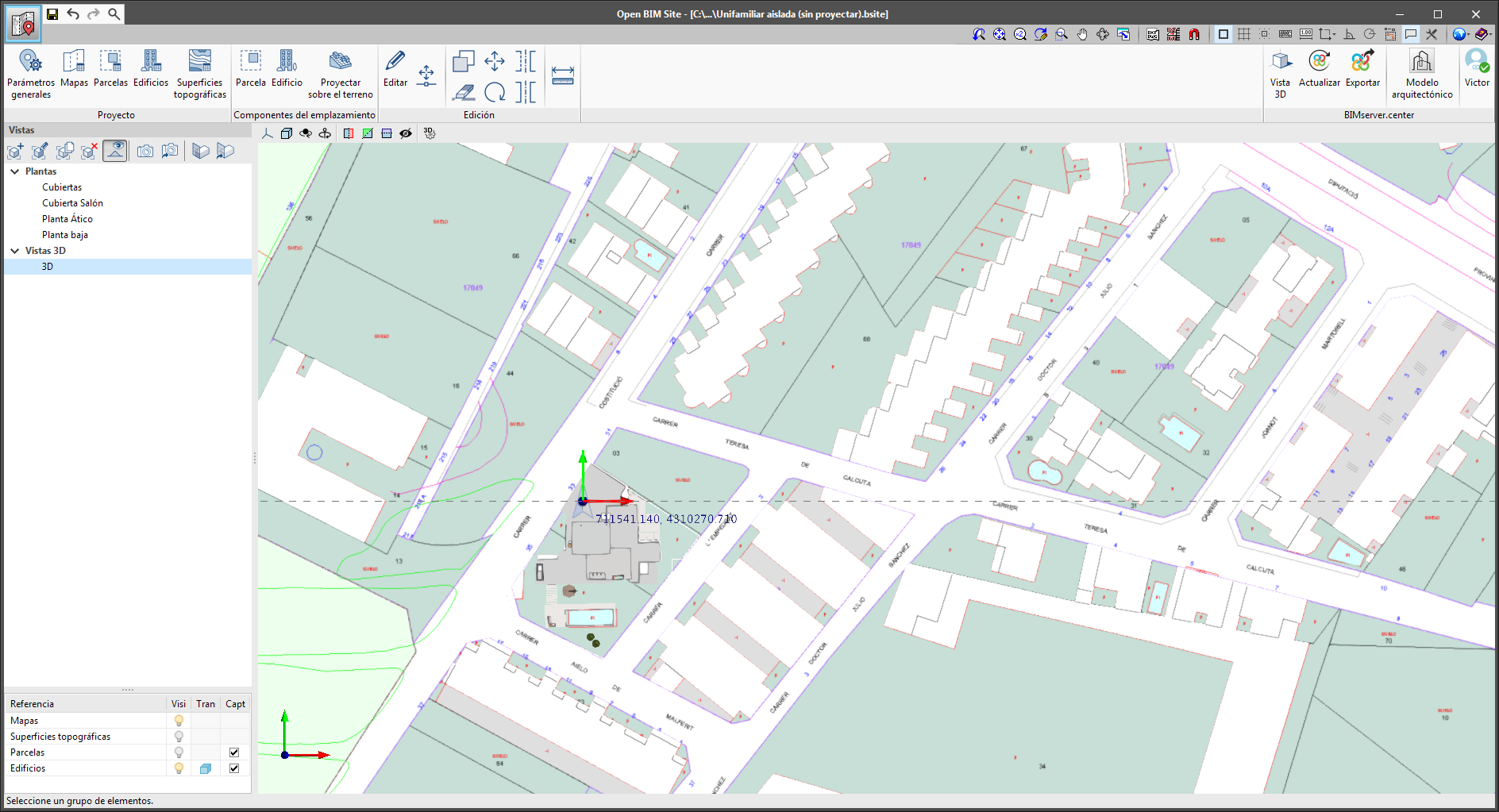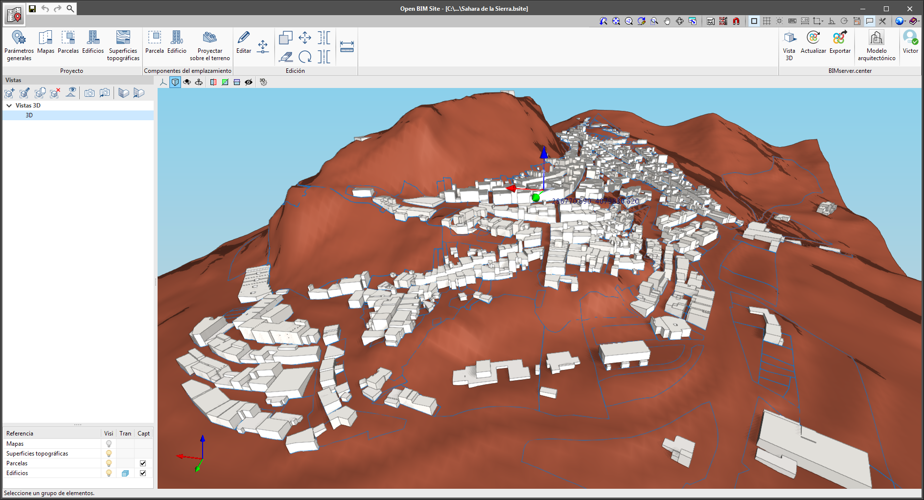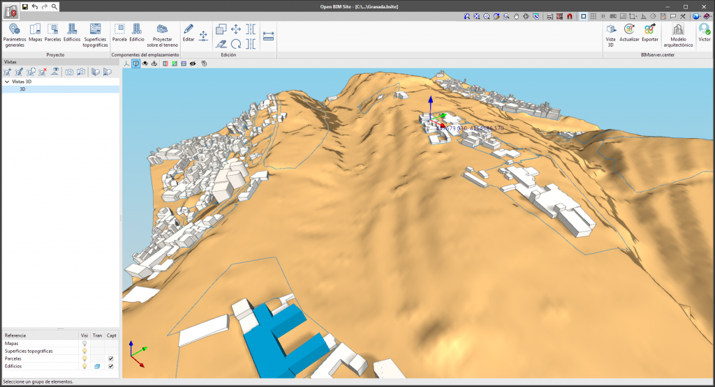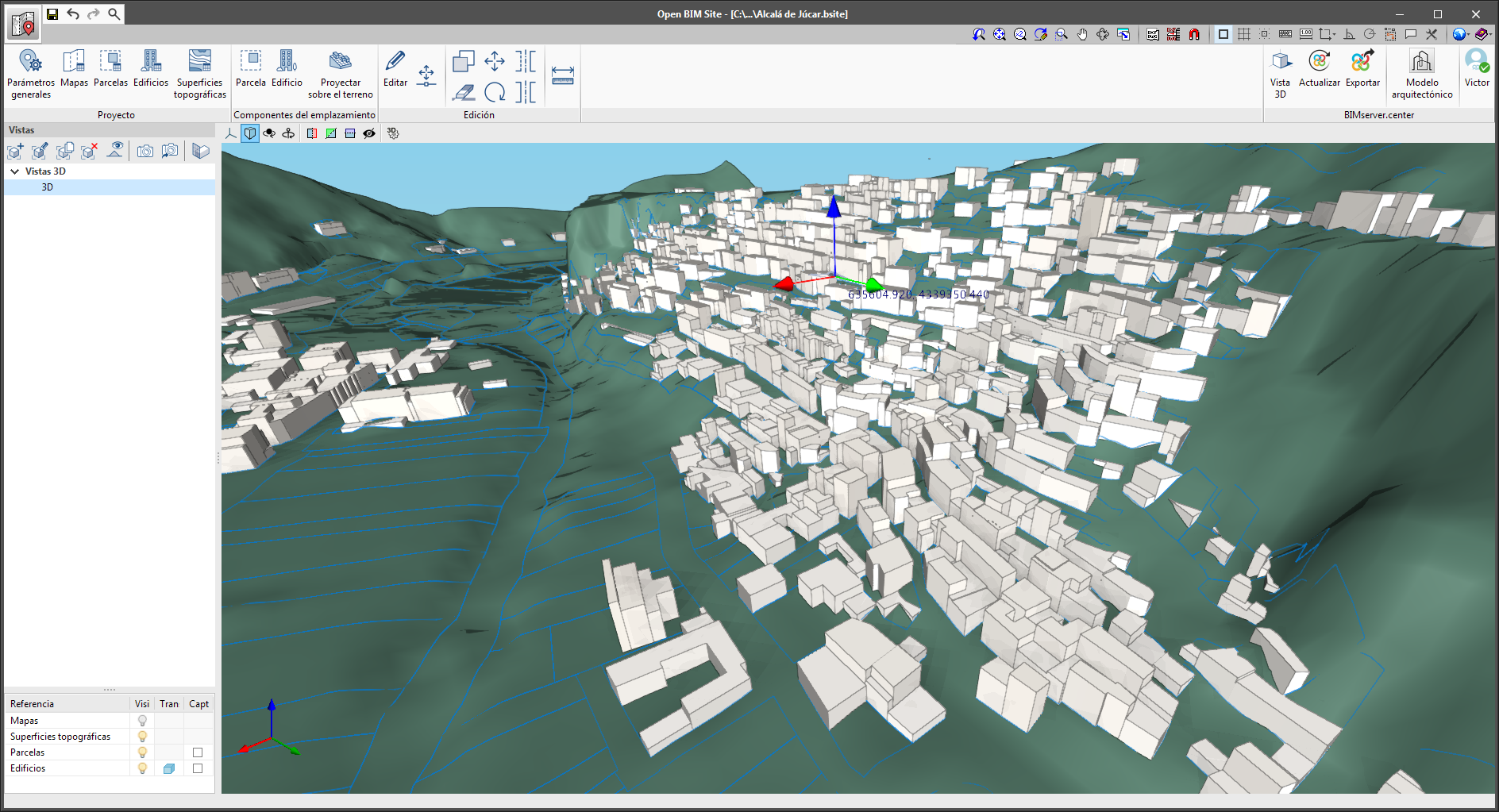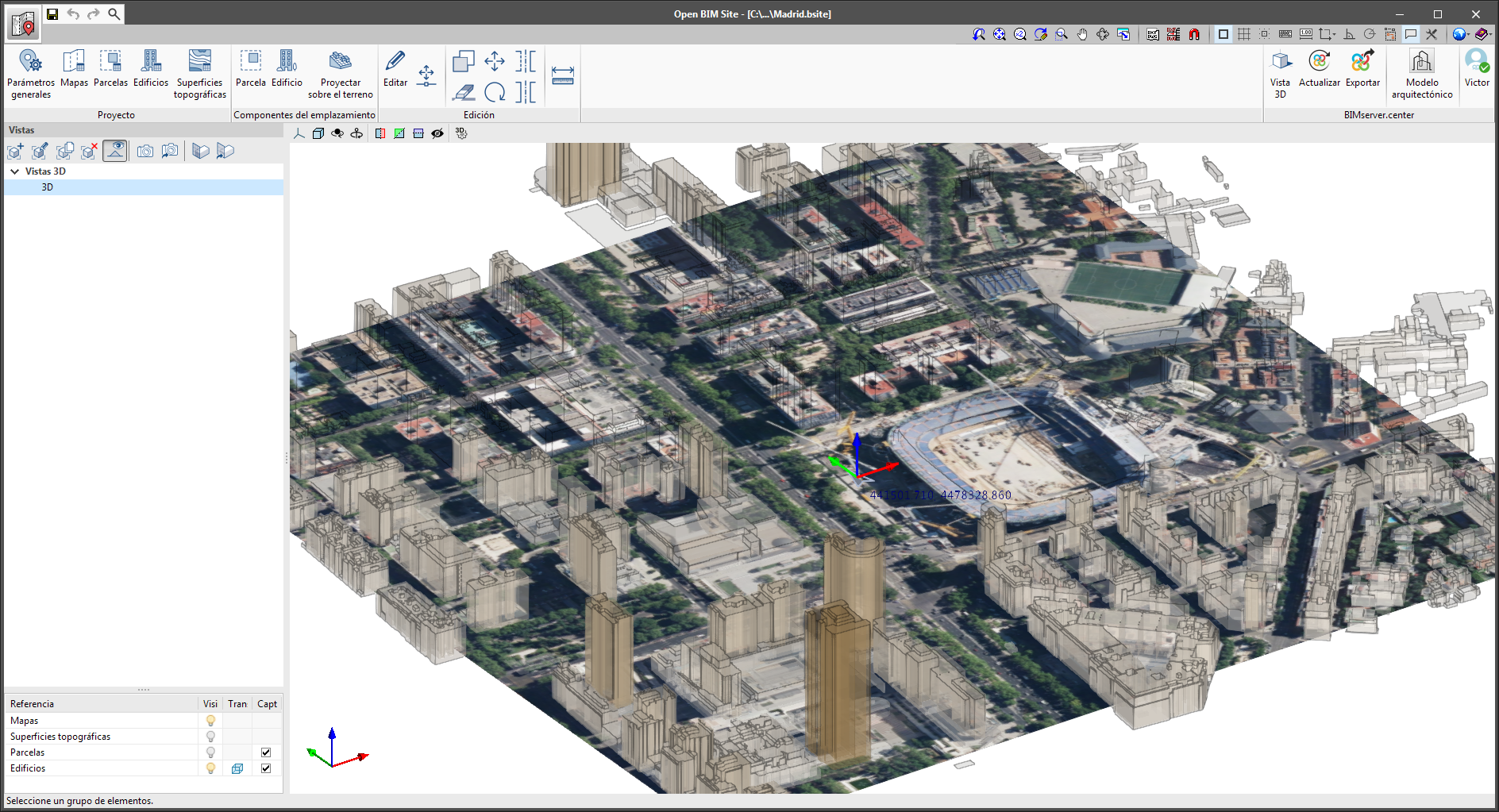 Open BIM Site es una aplicación orientada a definir las condiciones iniciales del emplazamiento de un proyecto. Mediante esta herramienta es posible establecer la ubicación geográfica de los modelos, administrar diferentes tipos de mapas, introducir superficies topográficas y añadir elementos propios del emplazamiento, tales como parcelas y edificios.