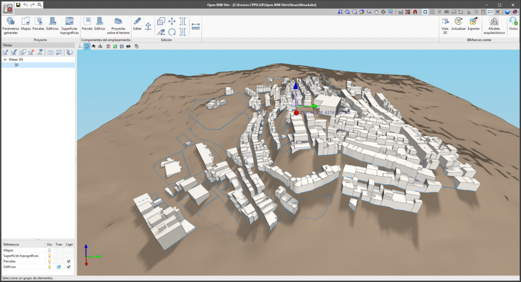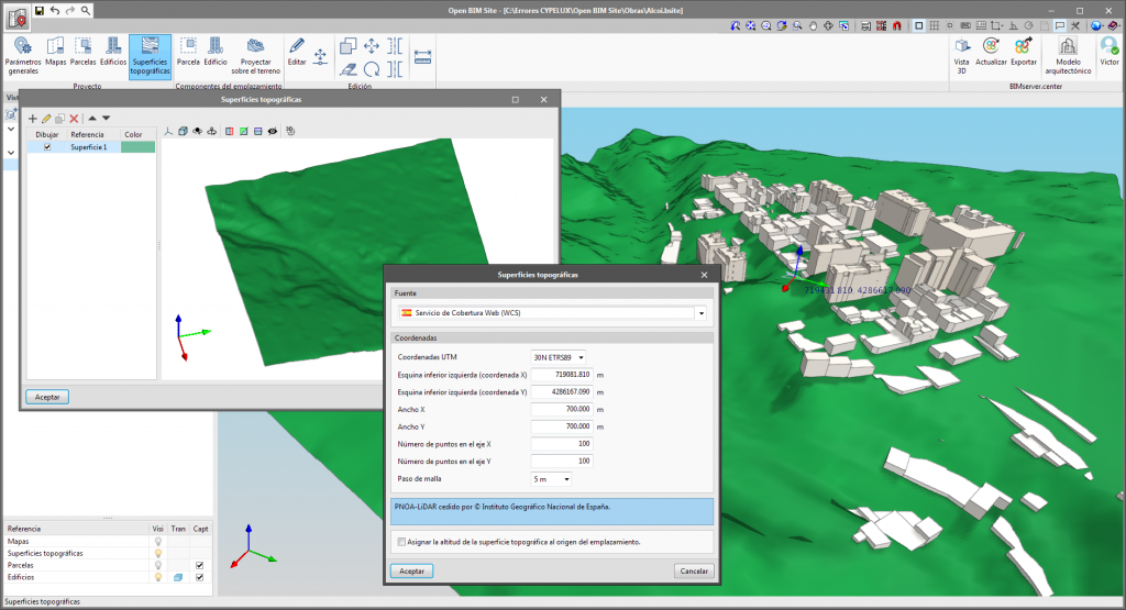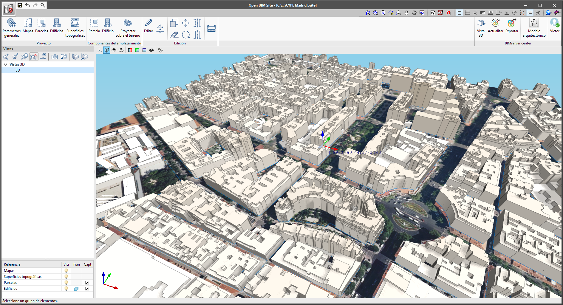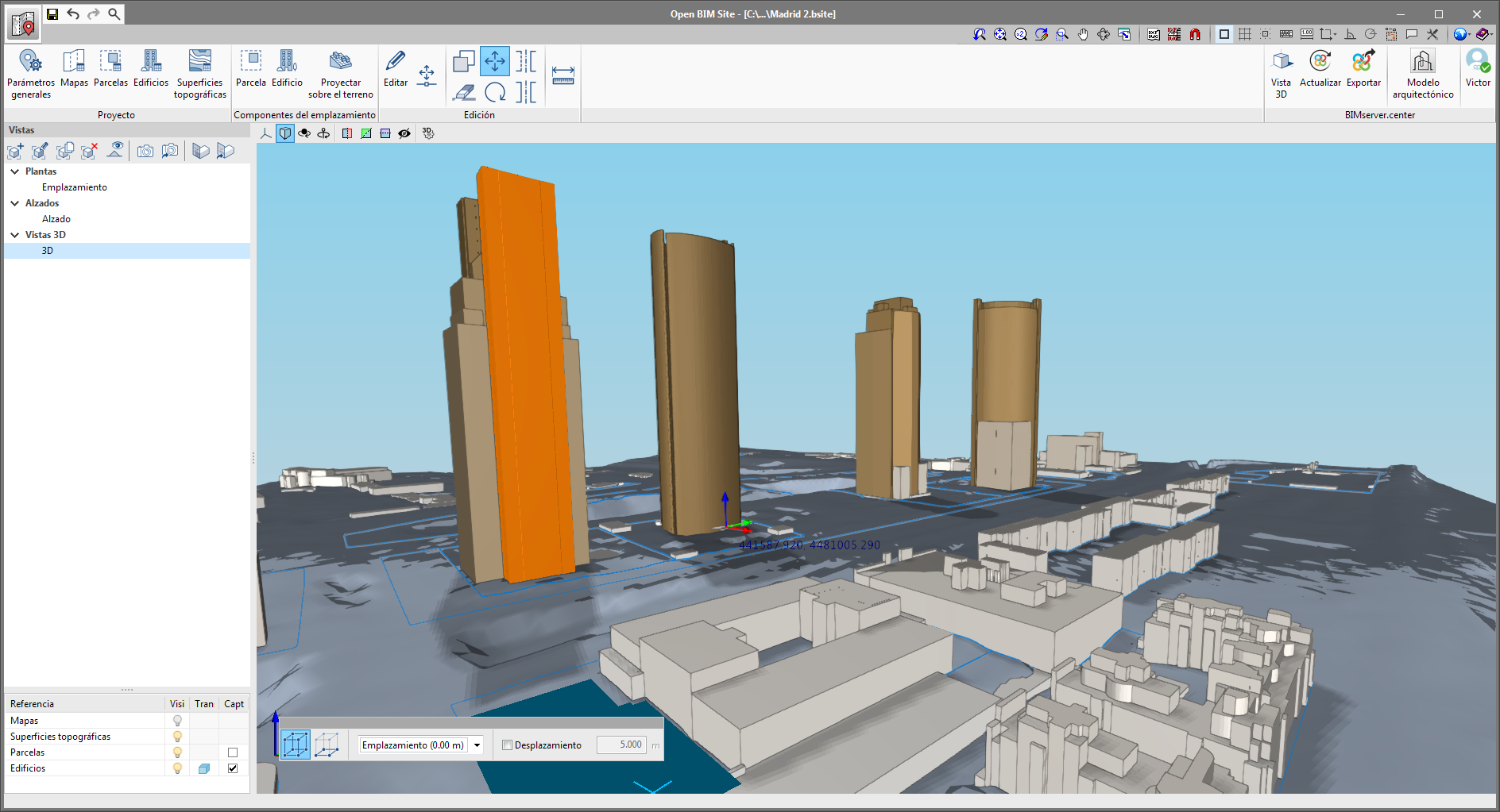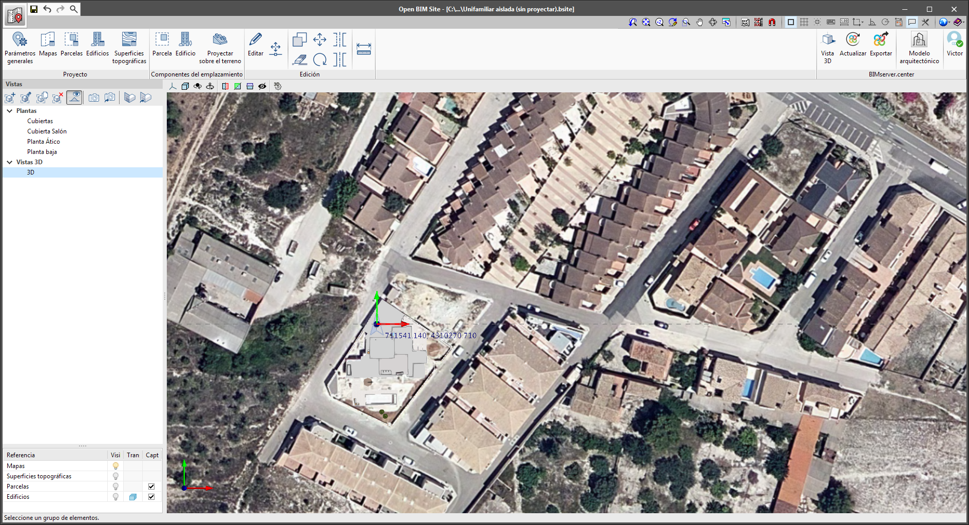 Open BIM Site es una aplicación orientada a definir las condiciones iniciales del emplazamiento de un proyecto. Mediante esta herramienta es posible establecer la ubicación geográfica de los modelos, administrar diferentes tipos de mapas, introducir superficies topográficas y añadir elementos propios del emplazamiento, tales como parcelas y edificios.
