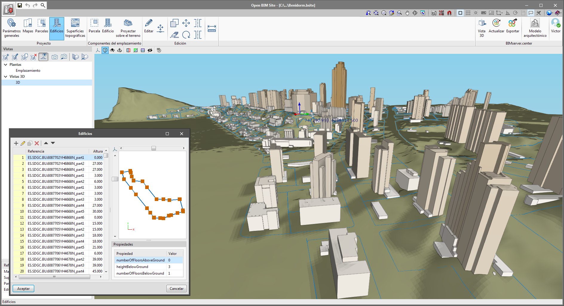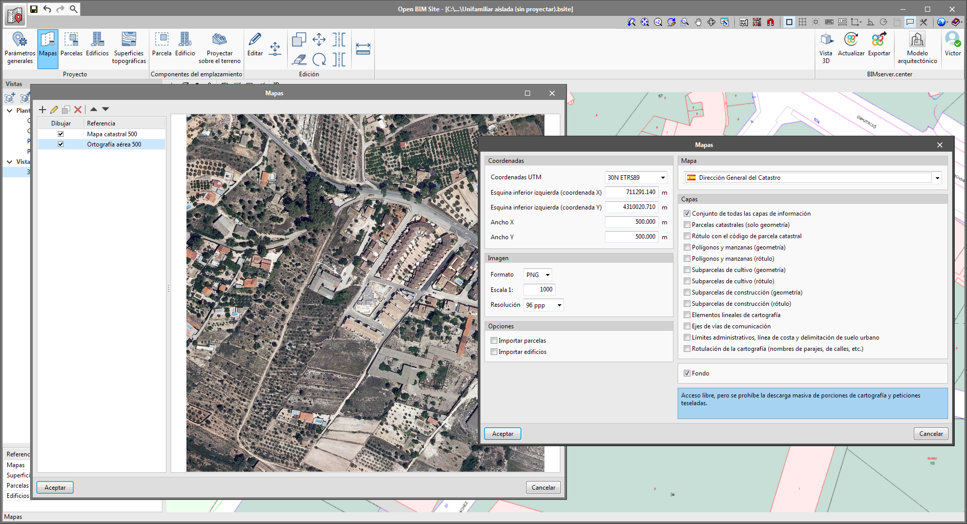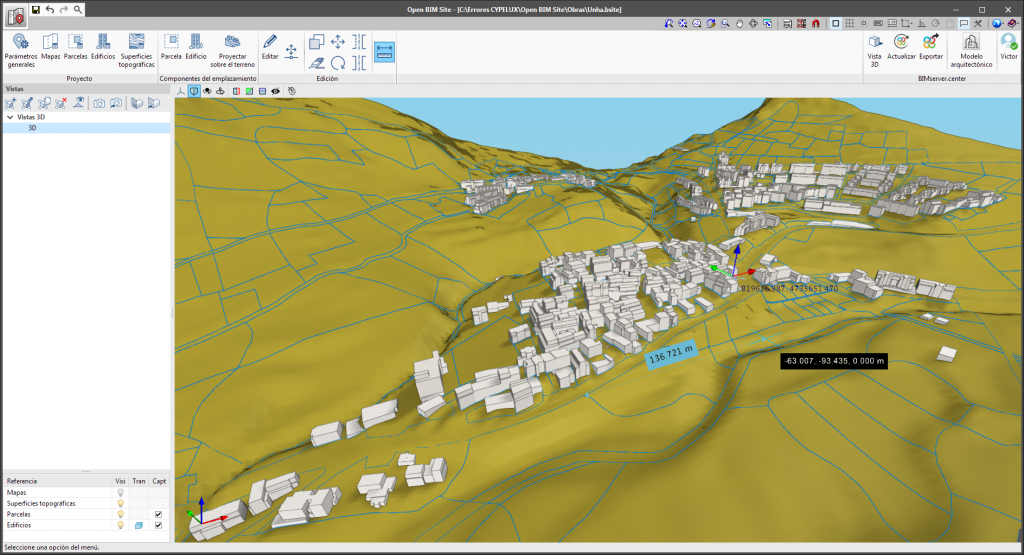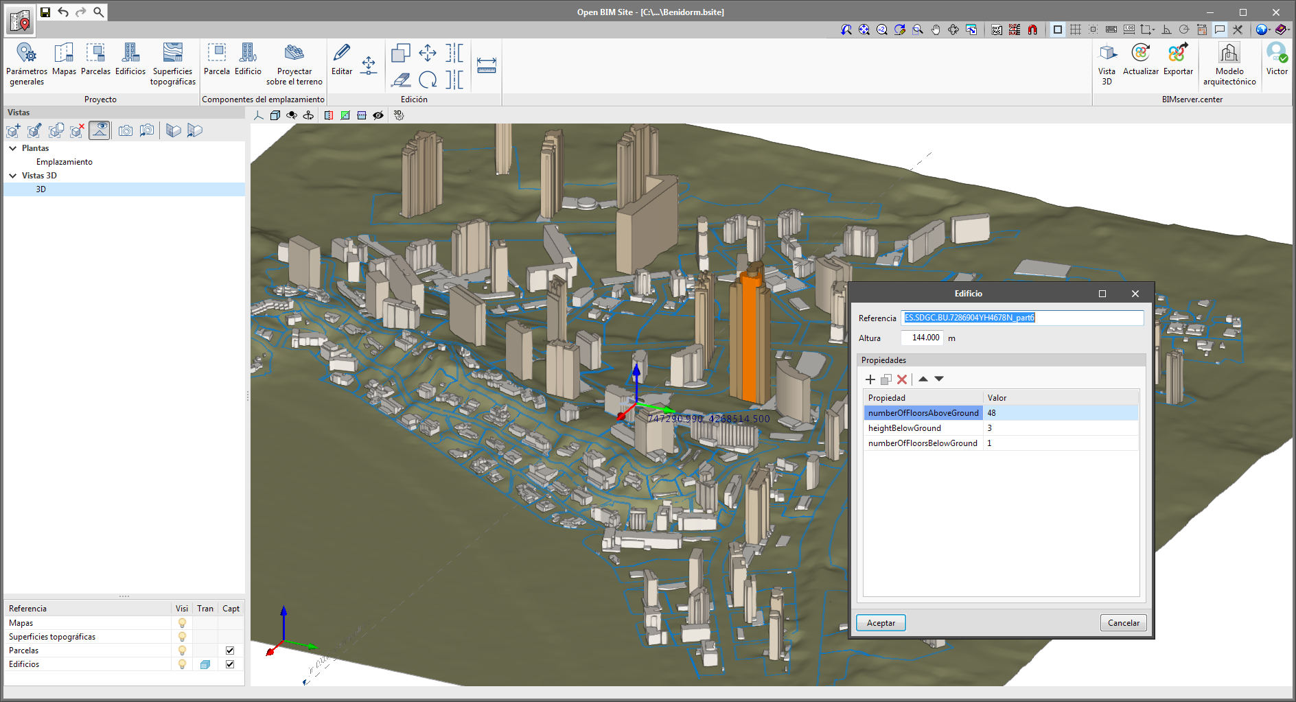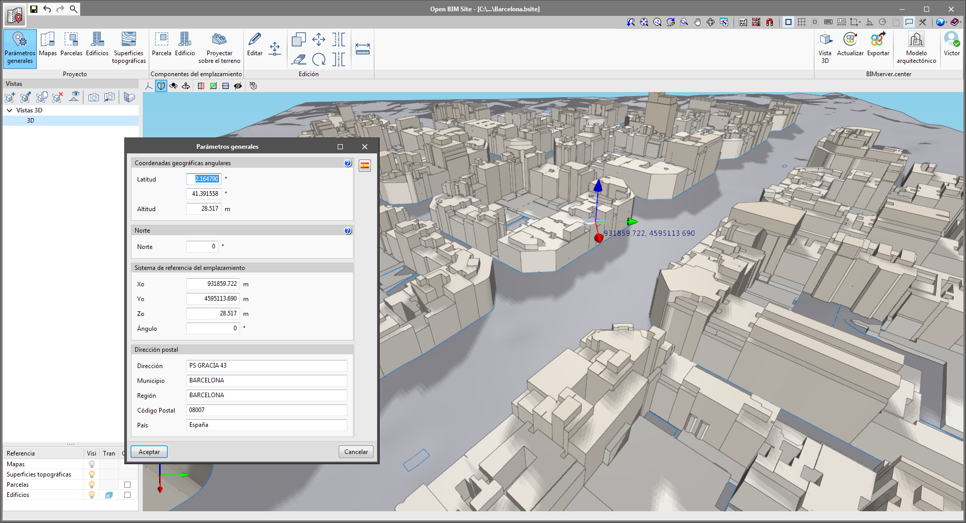 Open BIM Site es una aplicación orientada a definir las condiciones iniciales del emplazamiento de un proyecto. Mediante esta herramienta es posible establecer la ubicación geográfica de los modelos, administrar diferentes tipos de mapas, introducir superficies topográficas y añadir elementos propios del emplazamiento, tales como parcelas y edificios.